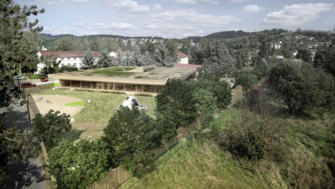 blíže k sousedící střední škole, takže minimalizuje zpevněnou plochu pro