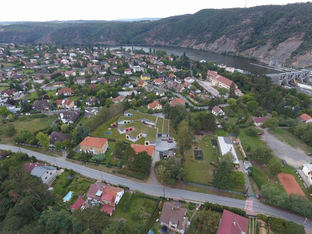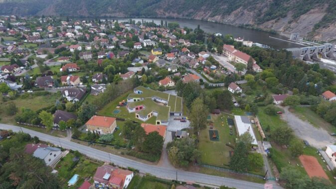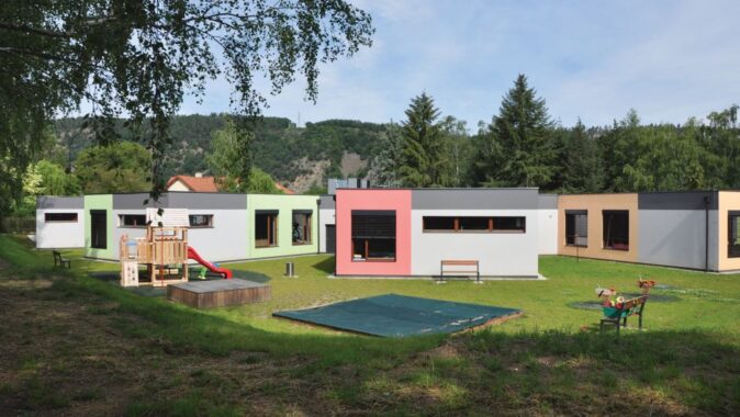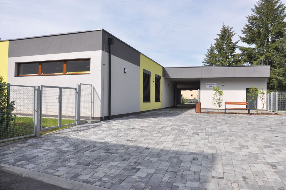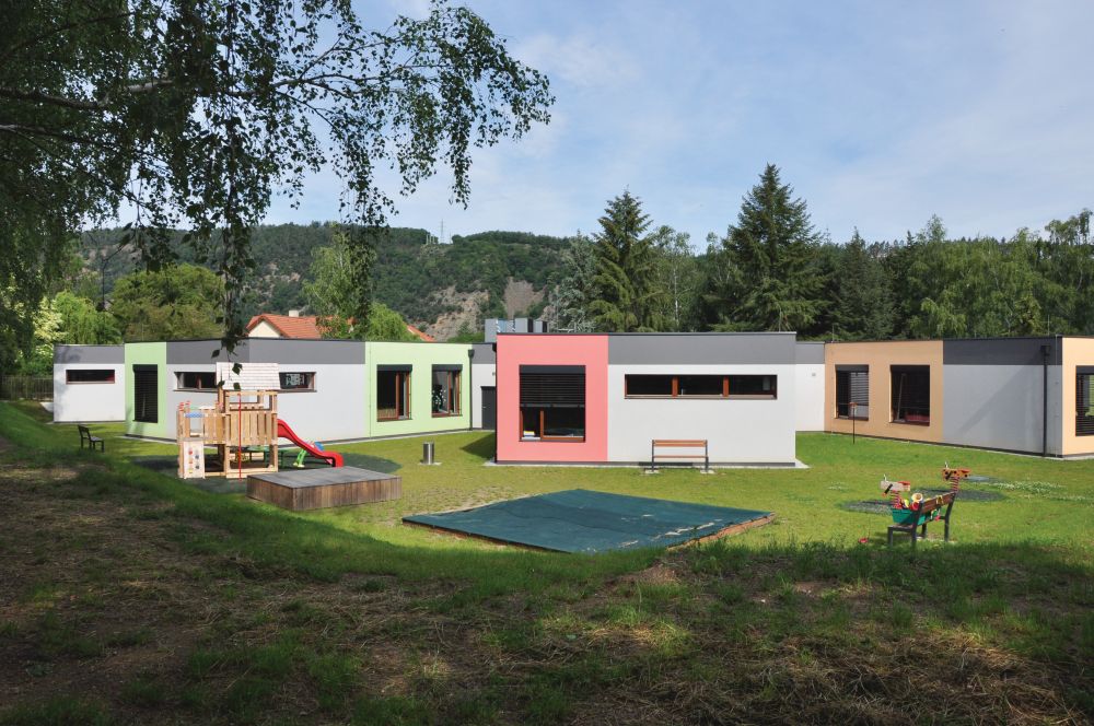 Pozemek se nachází v centru obce v klidné lokalitě zastavěné převážně rodinnými a bytovými domy. Nový objekt je umístěn v jeho jihozápadní části s orientací dětských denních místností převážně na jižní stranu. Rozčleněn je na několik kvádrů, které jsou odlišeny barevným odstínem fasády. Tyto barvy se prolínají i do interiéru pavilonů. Toto řešení tak vytváří členitou, ale logicky čitelnou tvář budovy a zároveň redukuje měřítko, objekt tedy působí menším dojmem a lépe koresponduje s okolním terénem a zelení. Kontrast vůči stávající zástavbě je zanedbatelný, ale umístění budovy a její členění je výrazným rysem a vhodně doplňuje okolní zástavbu.