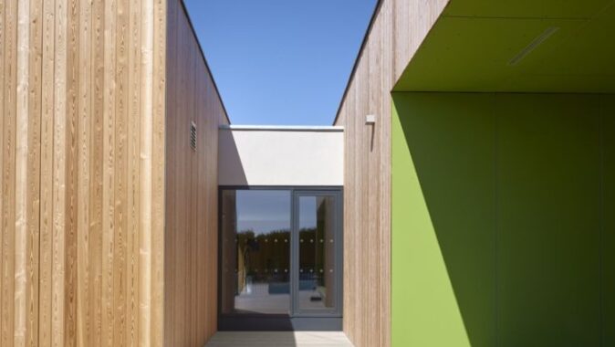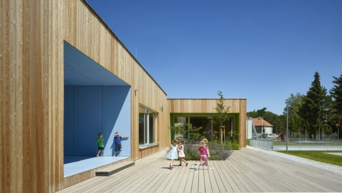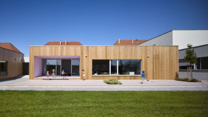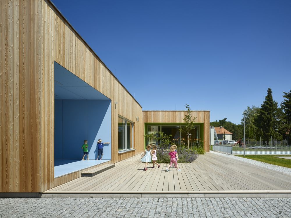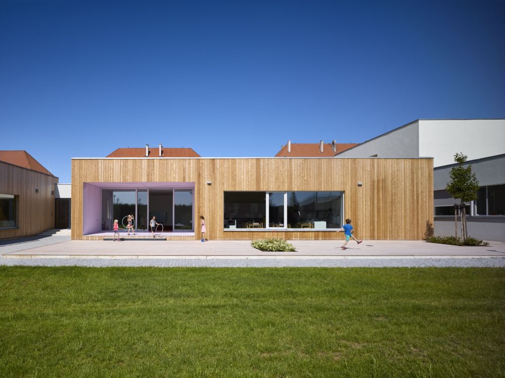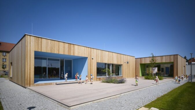 Konceptem návrhu bylo rozmístění jednotlivých přízemních pavilonů – oddělení do velké zahrady. V návrhu byly použity dva typy pavilonů, lišící se půdorysným rozměrem a vnitřním uspořádáním. Pavilony jsou vůči sobě pootočeny o 90° a vytvářejí tak mezi sebou zajímavé polouzavřené prostory pro pobyt dětí. Hlavní budova je umístěna na severní části pozemku. Její hmota graduje z přízemní části do druhého podlaží, kde jsou umístěny učebny. Velkorysou konzolou druhého podlaží je jasně definován hlavní vstup. Navazuje na chodbu, která vbíhá mezi pavilony a vytváří zajímavý komunikační prostor. Jednoduché kvádry pavilonů jsou prořezány minimálním počtem velkorysých otvorů, jejich výraz určuje zejména velká lodžie zprostředkovávající propojení s exteriérem. Ve stejném duchu kontrastu plných ploch a velkorysých otvorů je pojednána i hlavní budova.