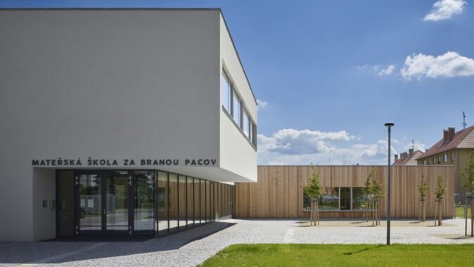 Pozemek se nachází severně od centra Pacova, v jeho těsné blízkosti. Na rozlehlé zahradě stála původní mateřská škola o pěti odděleních, která však byla v nevyhovujícím technickém stavu. Na jejím místě byla navržena nová budova splňující veškeré parametry současné stavby pro výchovu předškolních dětí. Dvoupodlažní stavba tvoří pět pavilonů, mezi hlavní budovou a komunikací je parkoviště pro zaměstnance a rodiče. Z hlavní budovy vybíhá jižním směrem velkoryse dimenzovaná chodba, která propojuje všechny pavilony. Pavilony doplňují velké dřevěné terasy. Celý areál propojují zpevněné plochy a cestičky.