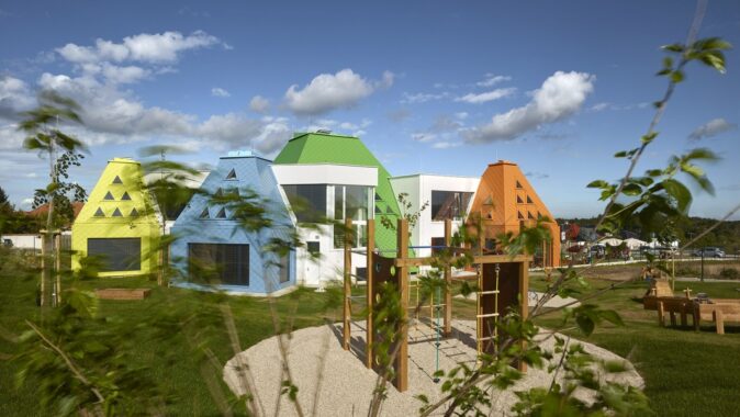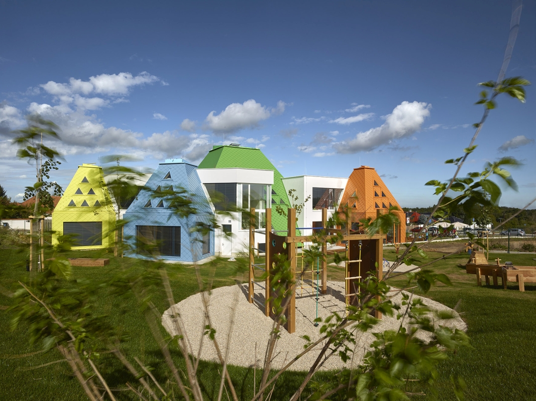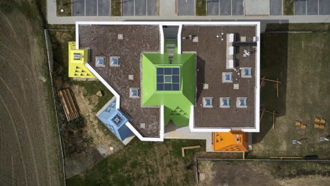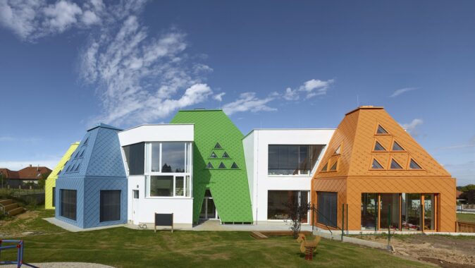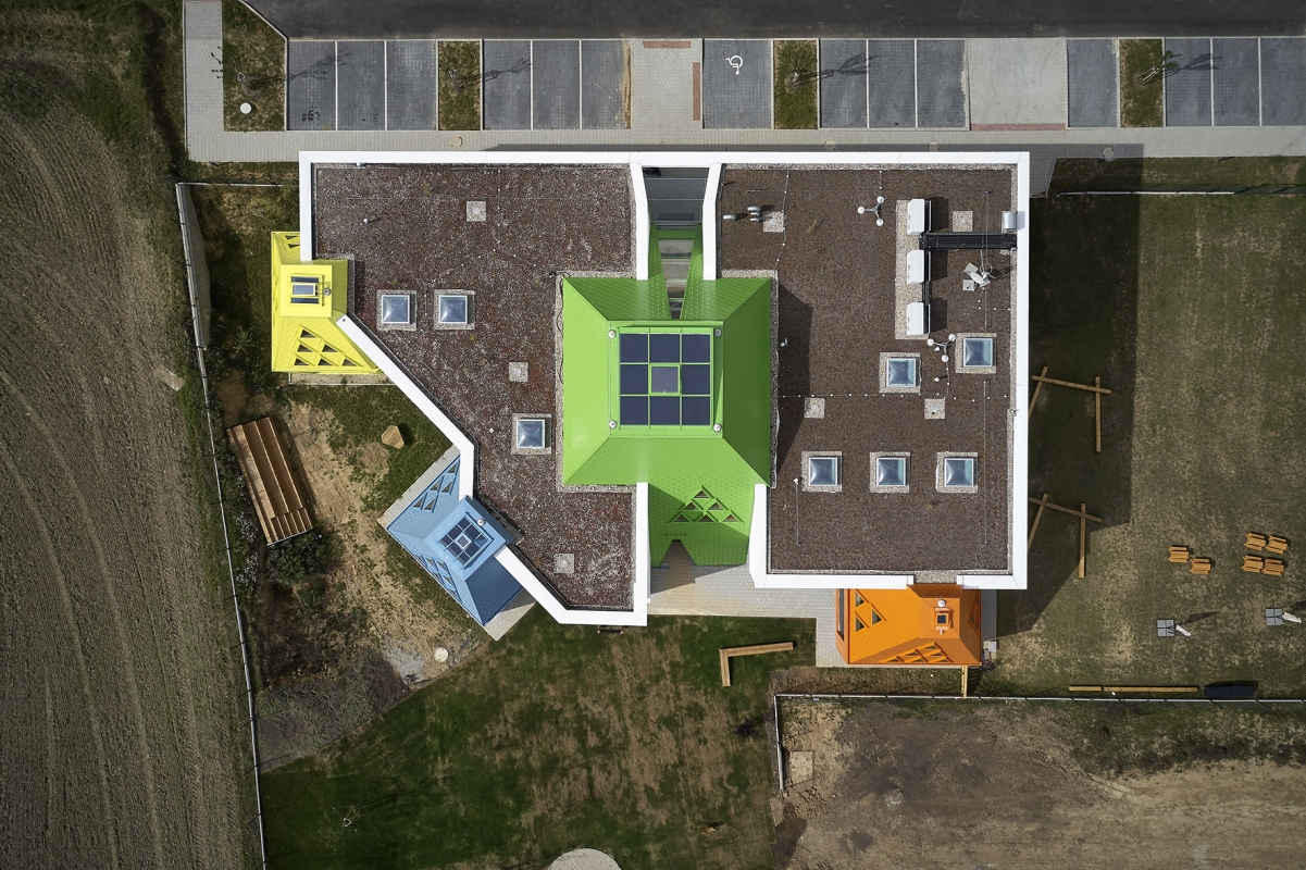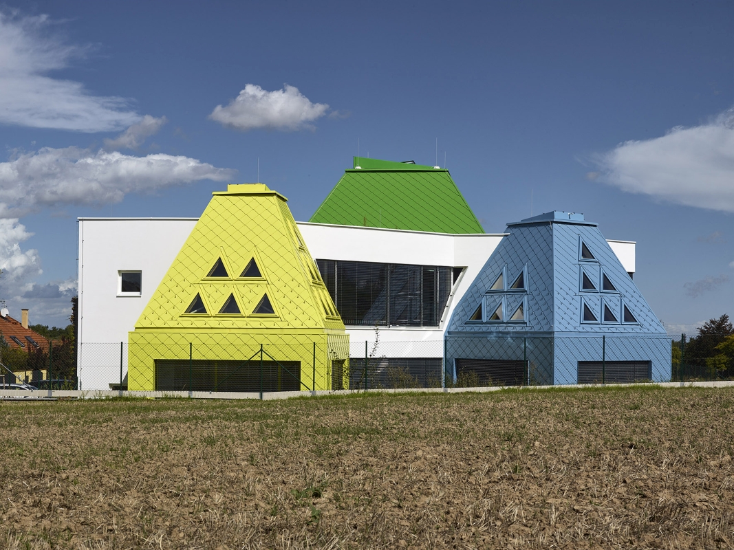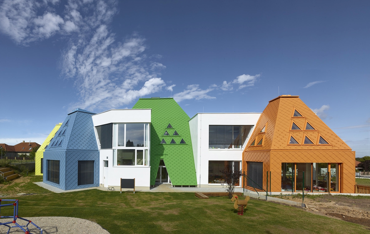 Zadáním města bylo navrhnout novostavbu školky se sportovním zaměřením, kapacitou pro 112 dětí ve 4 třídách, a objektem tělocvičny, který může sloužit i pro veřejnost. Školka byla plánována v rámci nového rozvoje území Říčany-Větrník. Na parcelu ve tvaru ‚L‘ jsme umístili trojici objektů a vzájemně je propojili – školku, tělocvičnu a zahradu. Tělocvična bude možná jednou realizována, zatím stojí objekt školky a zadní zahrada.