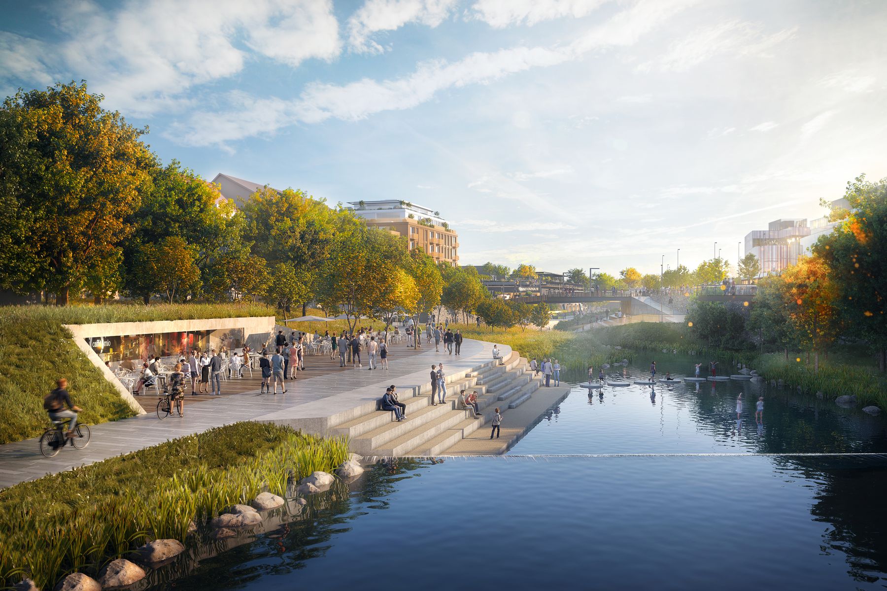 Na soutoku s řekou Moravou by mělo, v souladu s platným územním plánem, vzniknout nové přemostění lávkou pro pěší a cyklisty. Pozemky v trase plánované stezky jsou ve vlastnictví města, povodí nebo investora. Relativně nízký počet zúčastněných subjektů tím pádem dává šanci na shodu a zdárnou koordinaci celého záměru. „Olomouc se, stejně jako mnohá další města, od své řeky v historii bohužel odvrátila. Voda ale může výrazně pozvednout kvalitu života obyvatel ve městě, vdechnout jim novou energii i přinést zajímavé možnosti trávení volného času. Nová městská čtvrť je komplexní projekt, který přináší život do dosud opomíjeného území s velkým rozvojovým potenciálem. Usilujeme o splynutí několika různých projektů v jeden přirozený městský celek, jehož hlavní dominantou se stane Mlýnský potok. Obyvatelé Olomouce ho dosud příliš nevyužívali, stačí ale několik vhodných zásahů a zapomenutý potok se může rázem proměnit v atraktivní a živé městské nábřeží,“ popisuje architekt Martin Krupauer z ateliéru A8000.