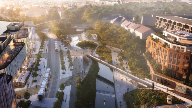 Řeka je důležitá součást města. Zlepšuje kvalitu života, dává příležitost volnočasovým aktivitám i klidnému posezení nad kávou u vody. Architekti proto navrhují nová severojižní propojení města, která položí základ pro dotvoření bezbariérové spojnice historického centra Olomouce s jižními předměstími a dále s přírodní lokalitou jižního údolí Moravy. Na břehu dosud opomíjeného Mlýnského potoka vznikne nábřeží, které umožní lidem přístup k řece. Návštěvníci zde najdou občerstvení, cyklostezku a místo pro hru s dětmi na souši i ve vodě. Území dnes omezuje mnoho bariér. Hlavním problémem je křížení se silnicemi a mosty, které neumožňuje plynulý pohyb chodců a cyklistů. To by se mělo změnit. Nový návrh vede cyklostezku podél břehu potoka, přičemž nezasahuje do samotného koryta. Využívá volné břehové plochy, v místě nábřežní zdi pak posunuje zeď dál od koryta a vytváří dostatečně široký prostor pro chodník. Plně respektuje systém protipovodňové ochrany města. Na několika místech, jako je most 17. listopadu, silniční a železniční most, pak cyklisté mosty podjedou.
