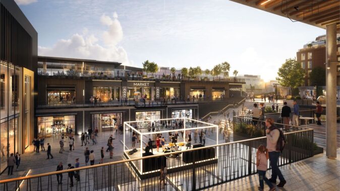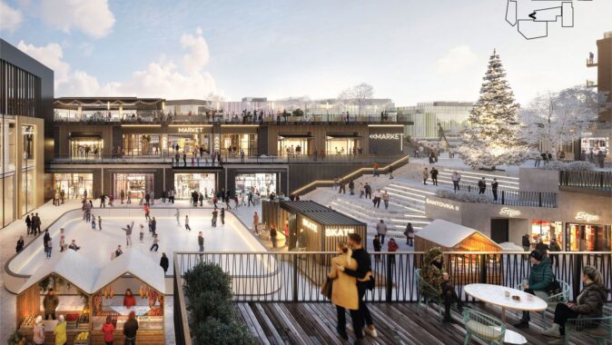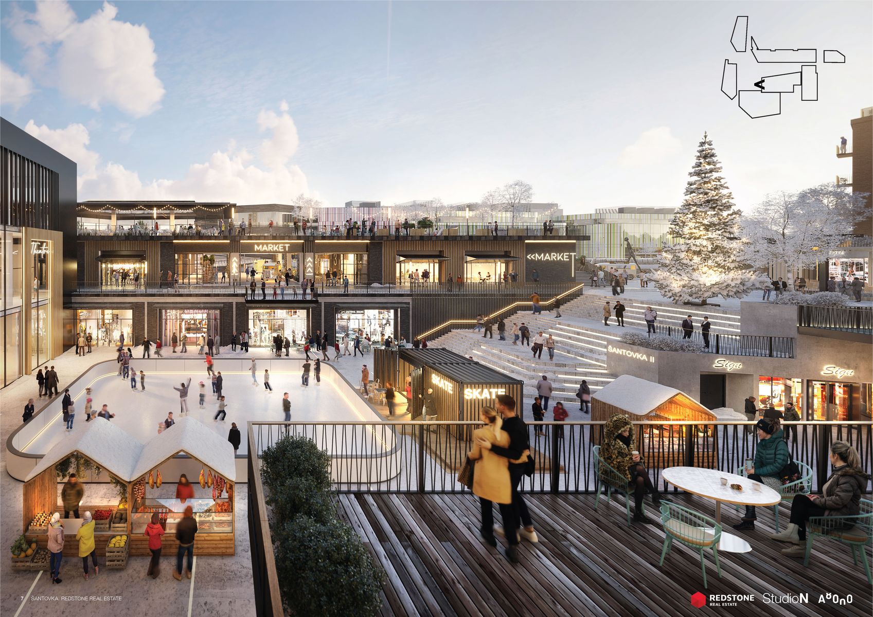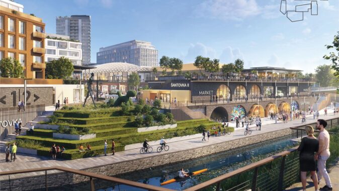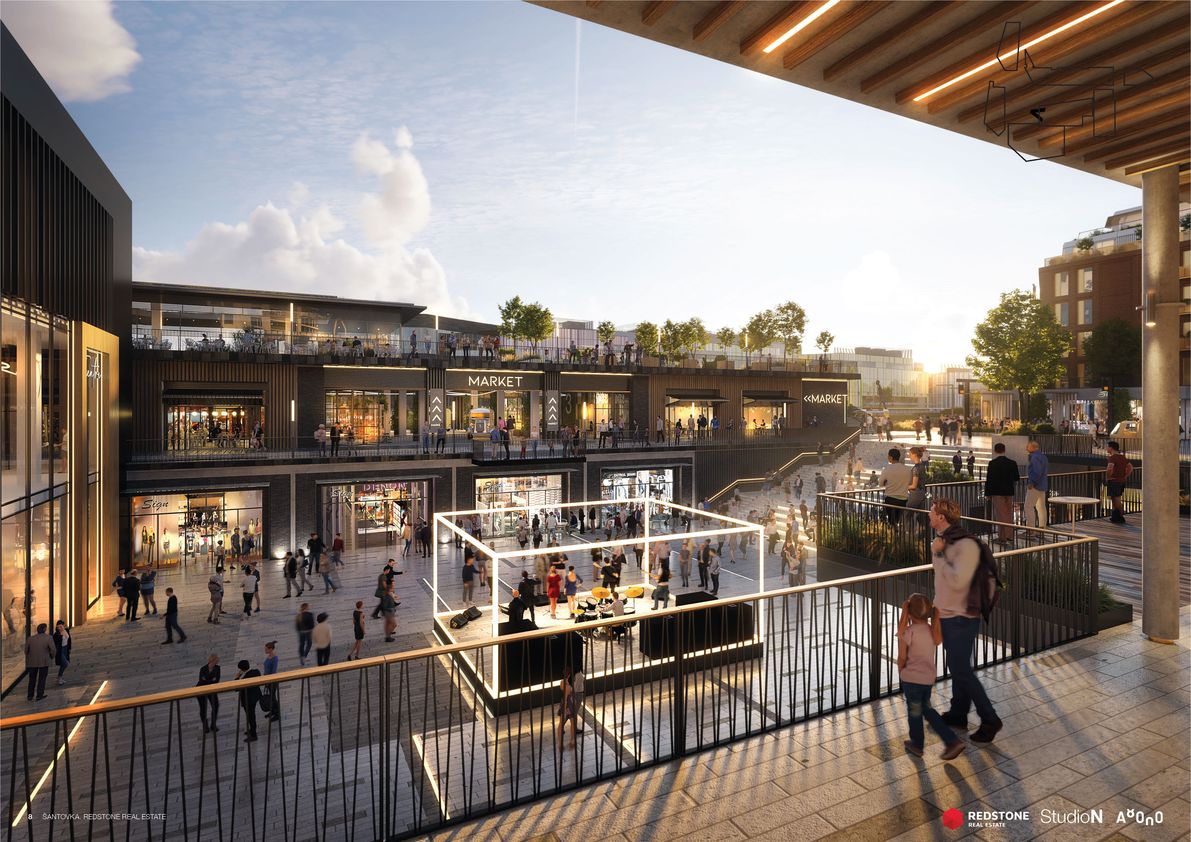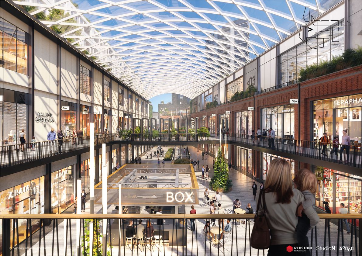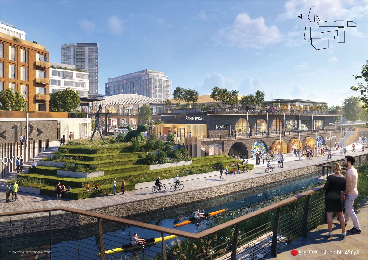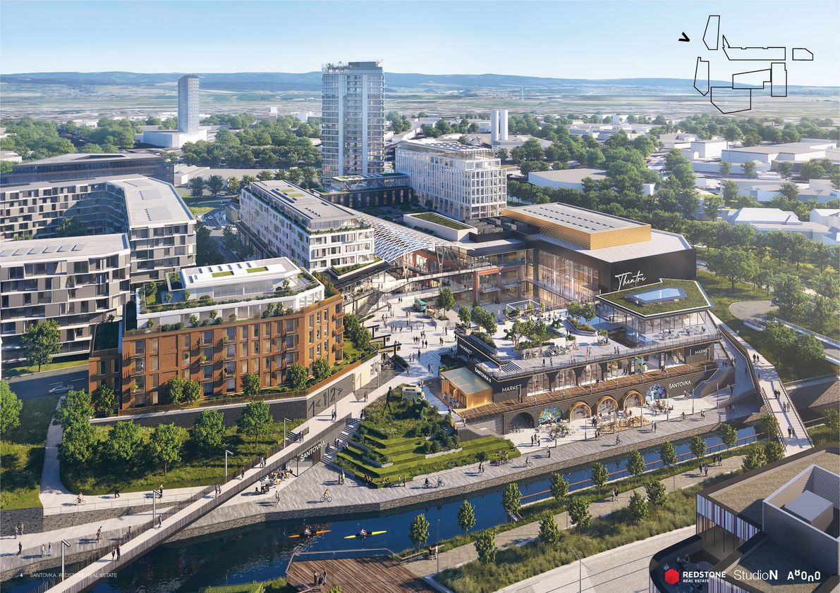 Mezi stávající a novou obchodní galerií vyroste centrální veřejný prostor. Architekti zde vytváří nový přístup k vodě i přes ni, kultivují zeleň a prostor doplňují o různorodé aktivity na nábřeží i ve vodě. Návrh počítá s kavárnou i dětským hřištěm. Plánuje se i rekonstrukce zbořeného jezu, tak aby byl bezpečný i prostupný pro ryby a další vodní živočichy. Variantou je také vodácký kanál, o kterém se zde v minulosti uvažovalo. Investor, Richard Morávek se skupinou Redstone, by chtěl začít s výstavbou nové Šantovky už v letošním roce. Oživení Mlýnského potoka by mělo následovat bezprostředně.