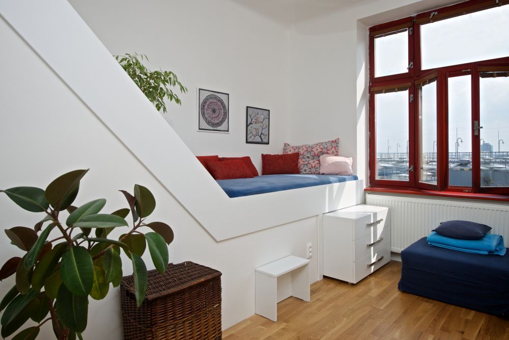 trochu nešťastně s výstupem směrem k oknům. Původní dispozice bytu tedy