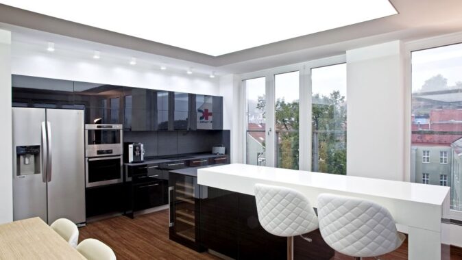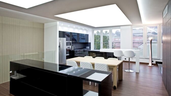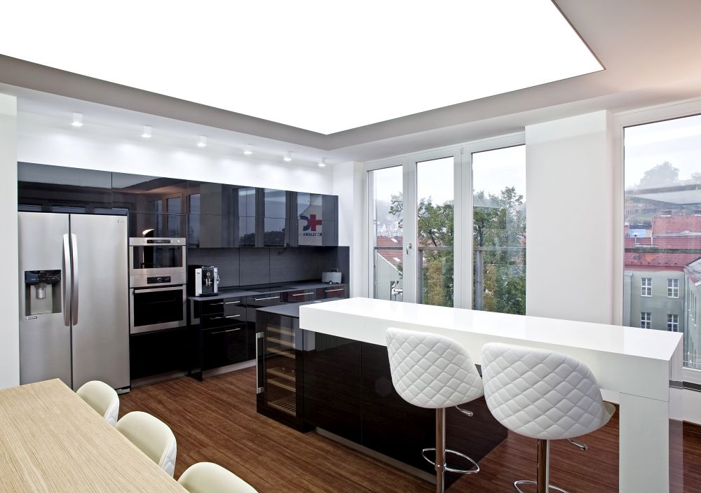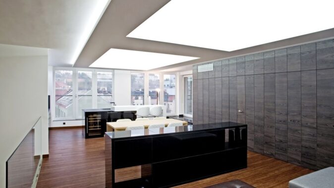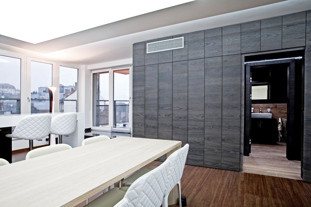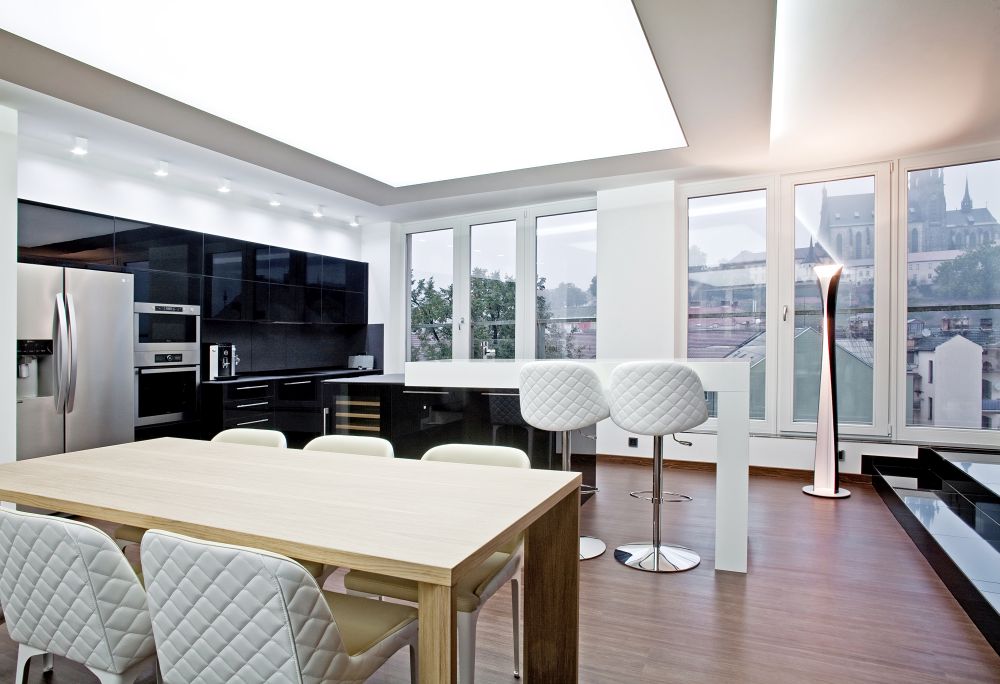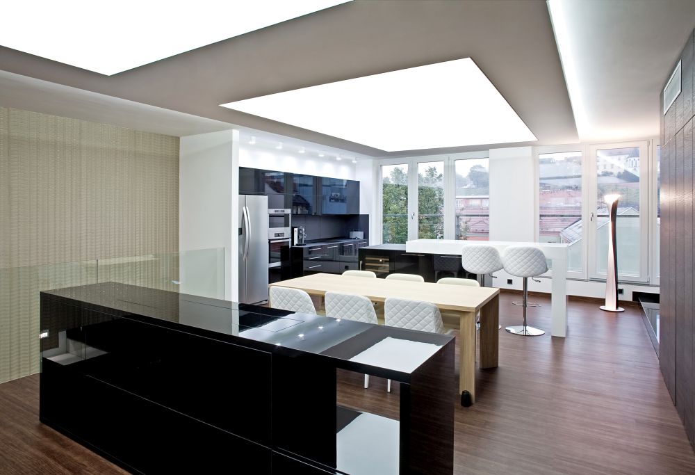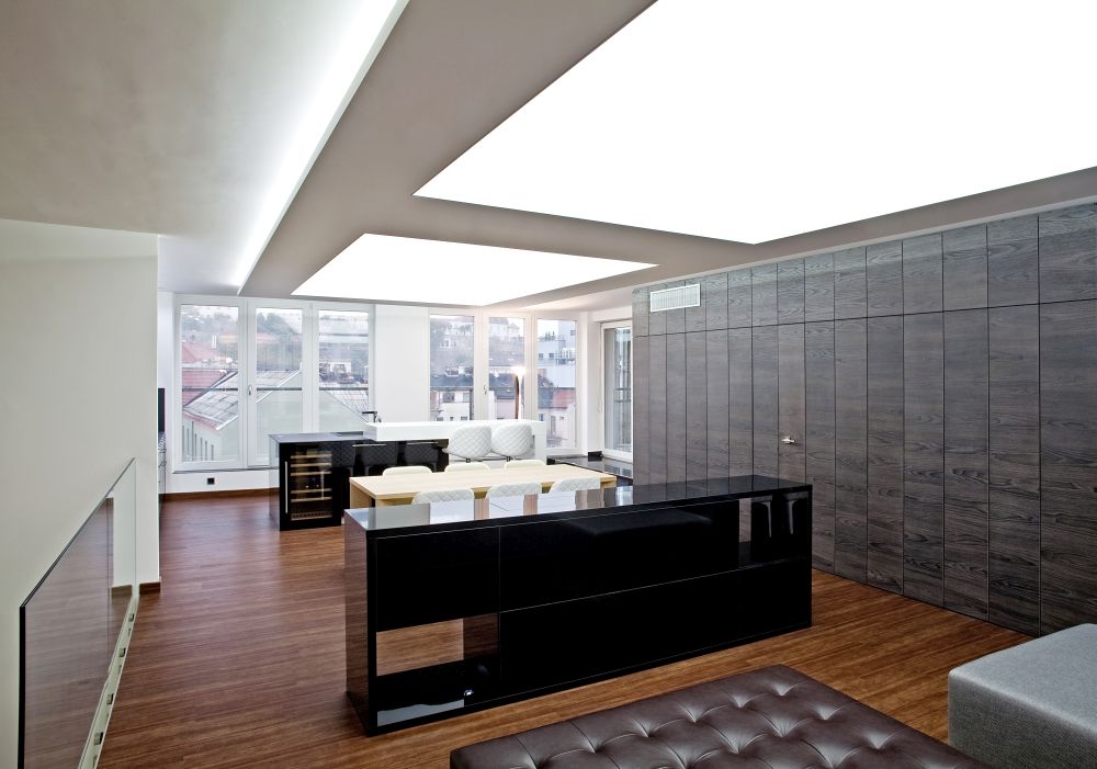 Ve spodním patře se do bytu vchází, je zde umístěna pracovna, ložnice a koupelna. Kvůli ložnici jsme zmenšili vstupní chodbu, díky prostoru pod schodištěm vznikla velká šatna. Schodištěm se vyjde do otevřeného prostoru horního patra s kuchyní, jídelnou a společenskou zónou. Na terasu v horním patře jsme navrhli hliníkovou pergolu s otočnými lamelami a screenovými roletami, které zabraňují pohledům ze sousedních domů. Pod pergolou je umístěné jídelní sezení a venkovní pohovka. Ve středu terasy je pódium pro slunění doplněné o vířivku a solitérní sprchu. Na terase je také systém skleněných satinátových zábran v kombinaci s velkoformátovými květináči, které vytvářejí intimní atmosféru nerušenou ruchem centra města.