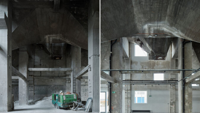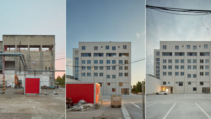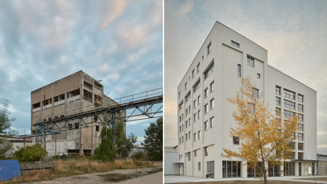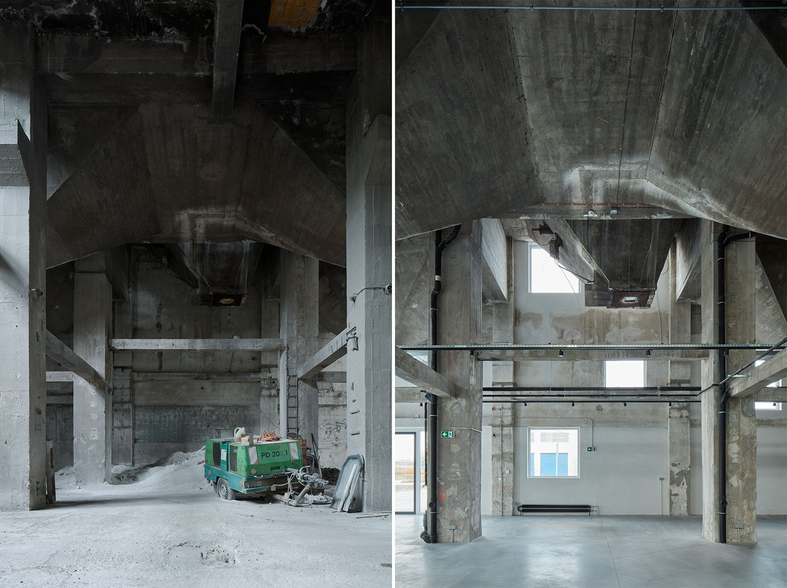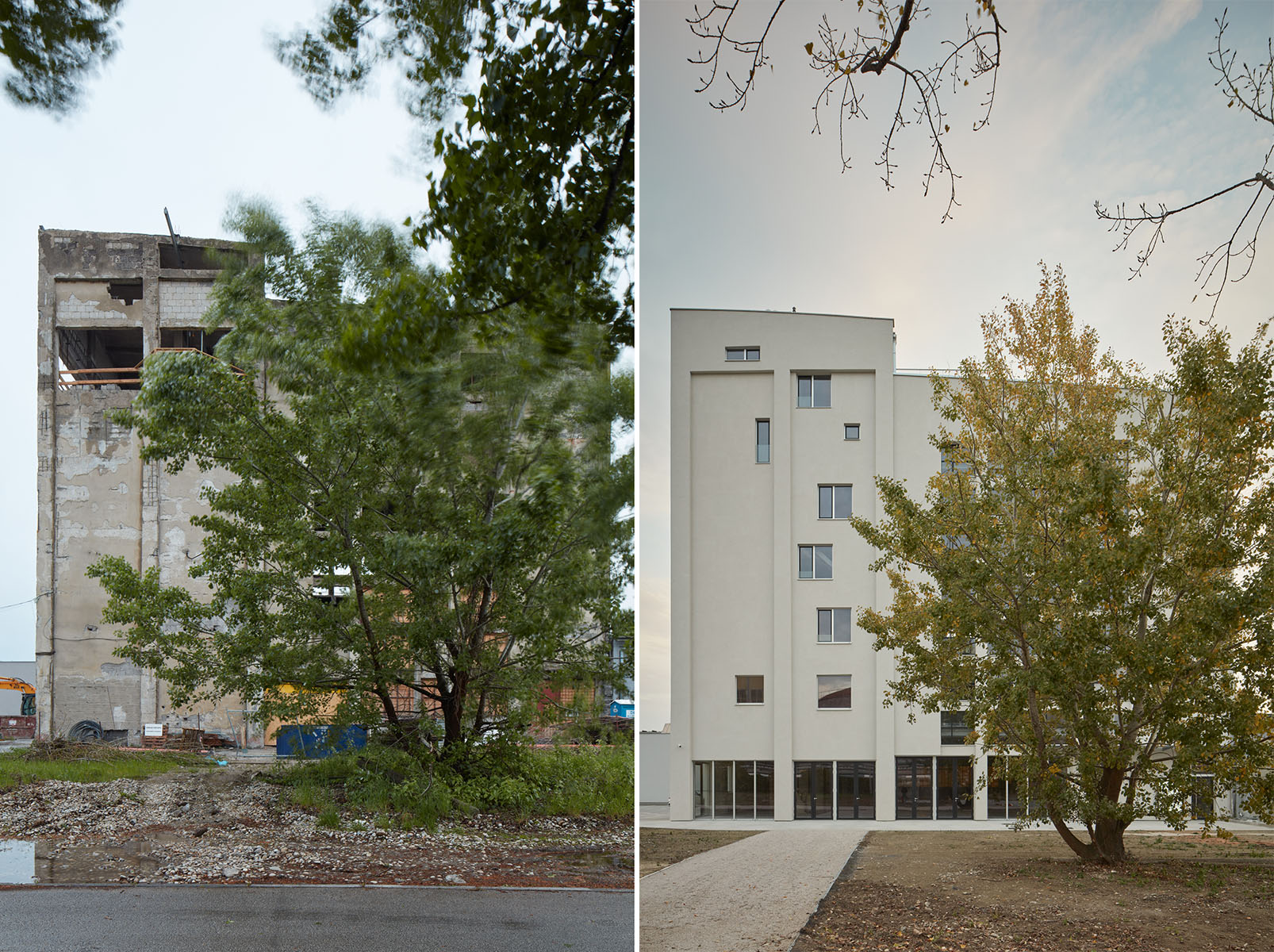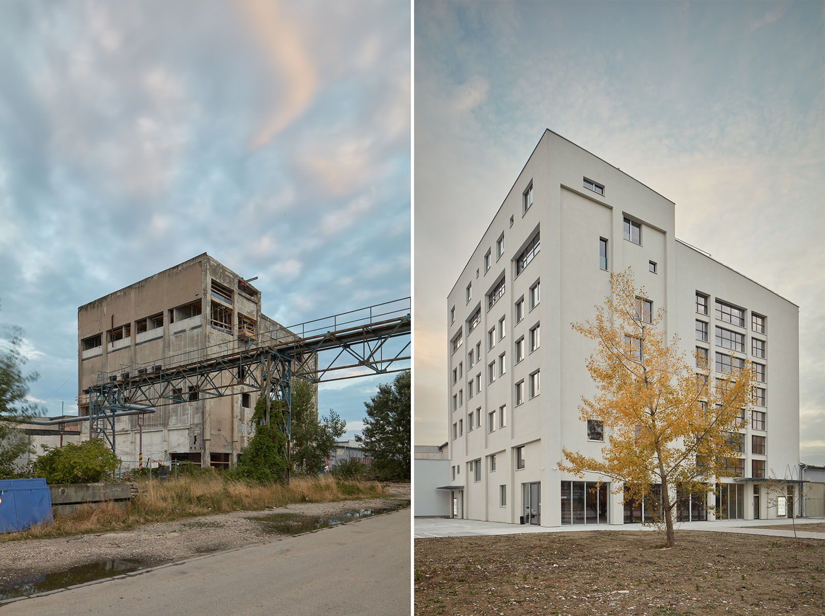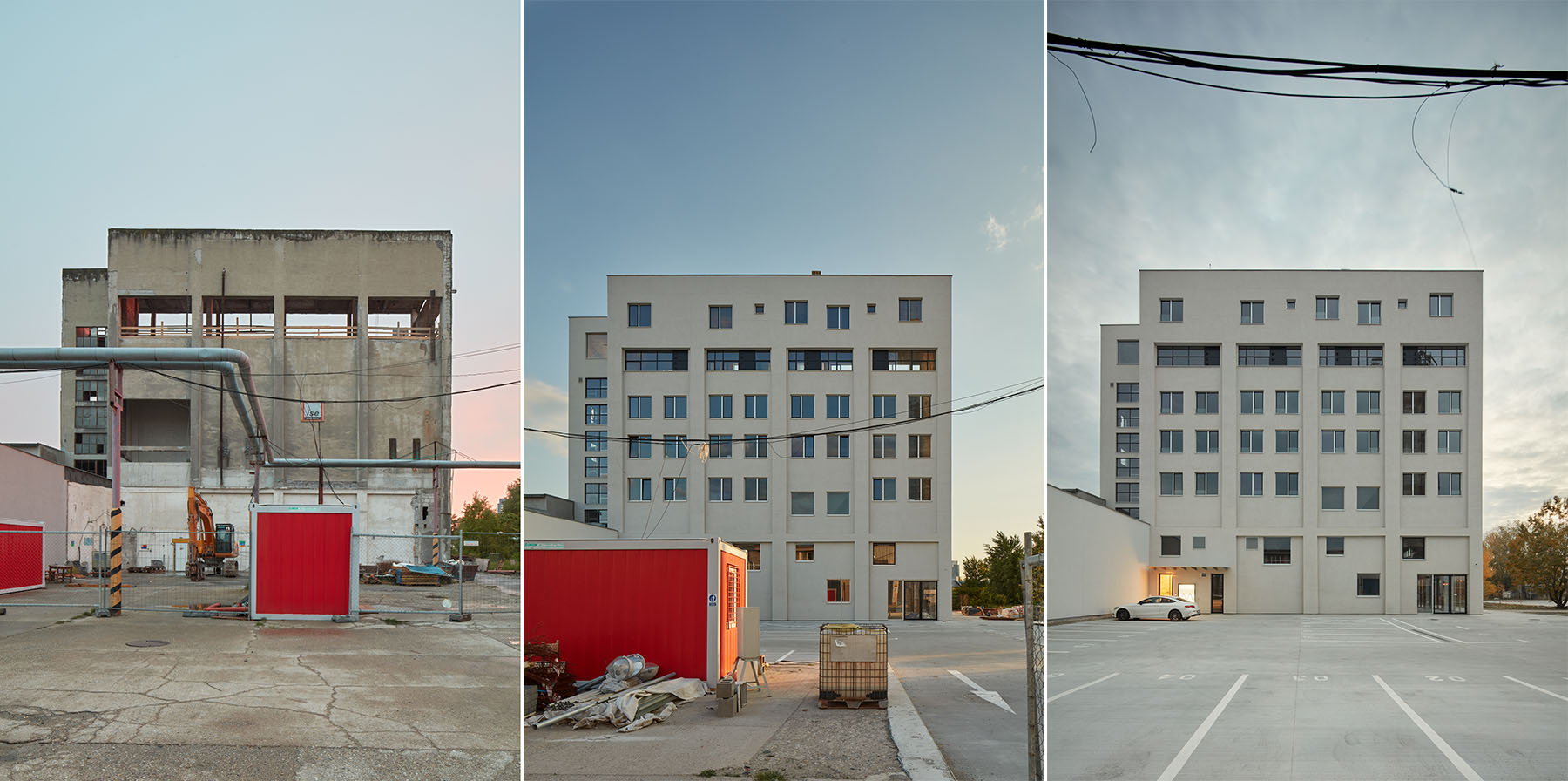 Architektonický návrh využíva konštrukčnú a statickú podstatu pôvodnej stavby. So železobetónovou kostrou vyplnenou pórobetónovým murivom fasád narába voľne a novú náplň len vkladá do existujúceho obalu. Fasády otvára účelovo na miestach, kde je to v súlade s novou dispozíciou, bez komponovania a s rešpektom k únosnosti existujúcich obvodových konštrukcií. Nové otvory majú voľnú a čitateľnú kompozíciu v protiklade k pôvodnej racionálnej mriežke okenných otvorov typickej pre industriálny objekt.
