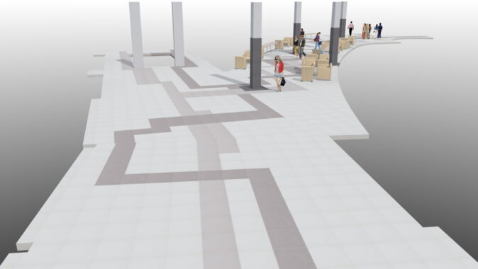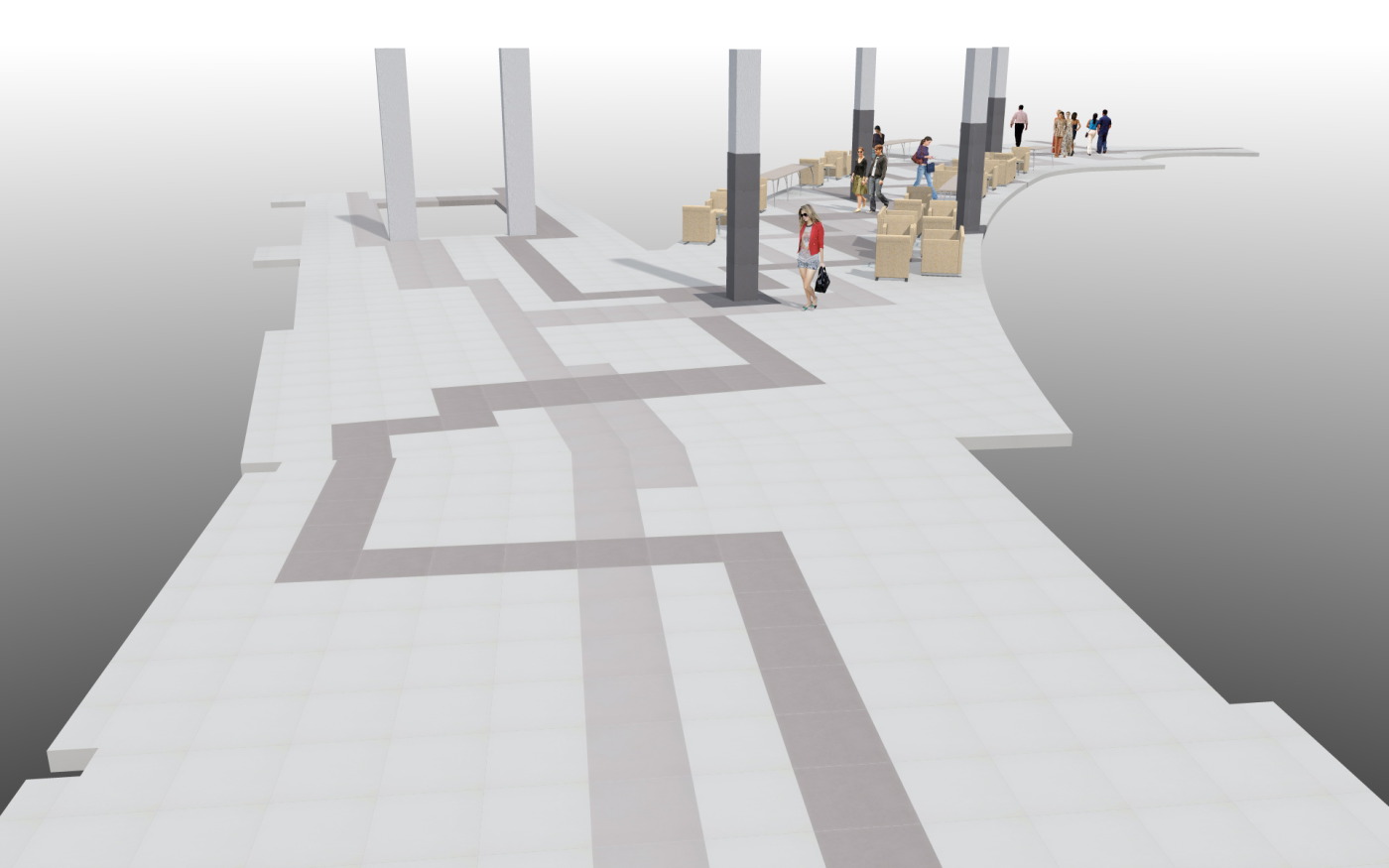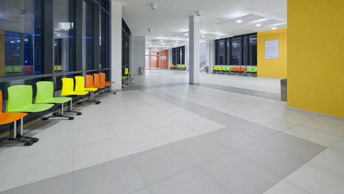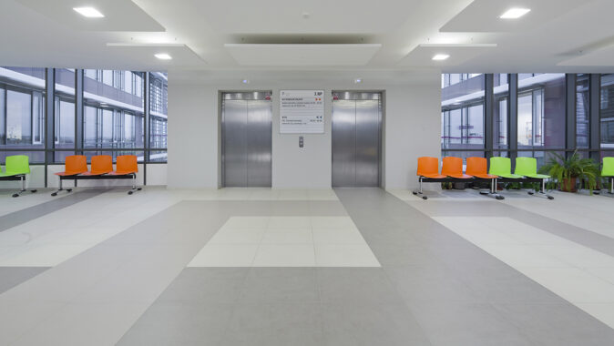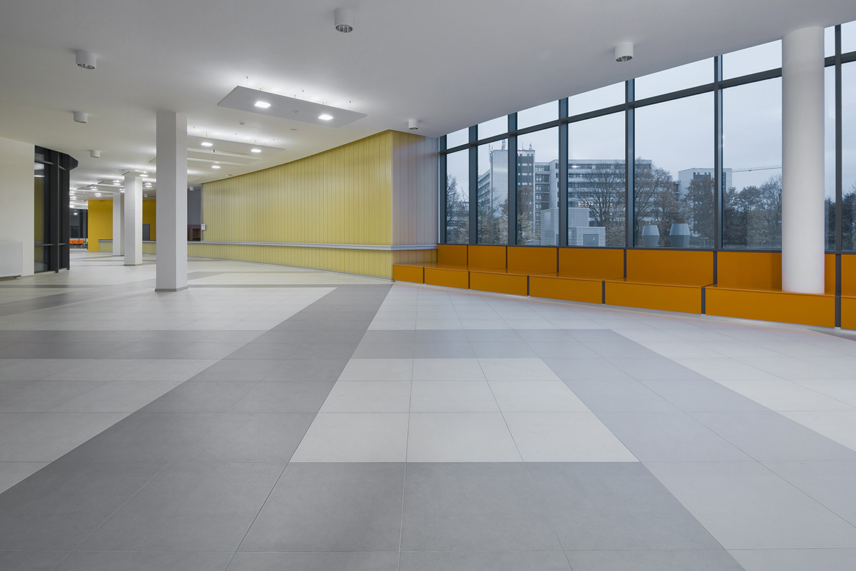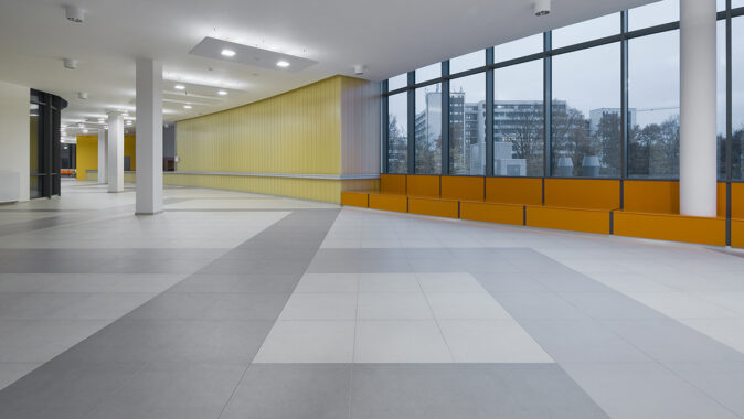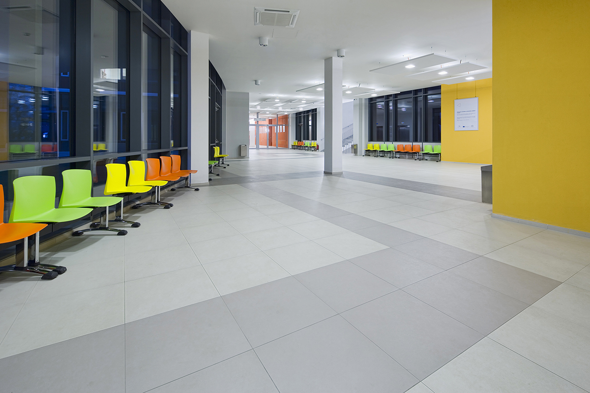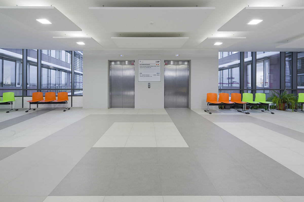 Keramické dlažby na chodbách, v hlavních a schodišťových prostorách a ve foyer, byly navrženy pro velkoformátový rozměr 60×60 cm. Ten byl v konceptu uvažován v pastelových odstínech matného charakteru tak, aby jemný rastr nebyl dominantní a velké plochy byly rozděleny odlišnými barevnými kompozicemi, které vedou návštěvníka např. k výtahovým věžím a tím pomáhají naplnit orientační systém v budově. Neutrální charakter podlahám dodaly slinuté dlaždice RAKO ze série TREND v odstínech slonové kosti, světle šedé a šedé. Výrazné barevné odstíny stěn opticky „zajíždí“ do této neutrální pastelové dlažby a tím dochází k harmonické hierarchii navržené barevnosti v objektu. Velkoformátový rozměr 60×60 cm měřítkově zapadá do celku realizovaných interiérů v objektu, zatímco v provozních chodbách se uplatnily menší formáty dlaždic o rozměrech 30×60 cm.