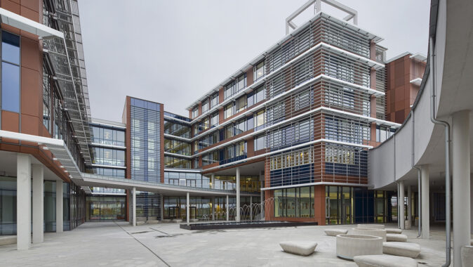 Vlastní objekt je navržen jako monolitická konstrukce se skrytými průvlaky. Obvodový plášť je částečně prosklený s vystřídáním ploch z pevných materiálů (voštinové desky) tvořících barevnou koláž. Závěsný hliníkový systém a horizontální žaluzie jsou předsunutou částí, která objektu dodává plasticitu a výtvarnost v dělení jednotlivých ploch. „Moderní prvek skla s pokovenou částí působí odlehčeně a zároveň vyváženě k pevné mozaice stěnových obvodových panelů. Věda a výzkum jsou hybnou kreativní myšlenkou, kterou podporuje v těsném spojení výuka,? vysvětluje Ing. arch. Jiří Opl, zastupující ATELIER SOUKUP, a doplňuje: „Roztočená spirála eliptického atria vrcholí věží, odkud je myšlenka vědy a výzkumu přenesena do světa“. V exponovaných pohledech se výtvarně uplatňuje krajní schodiště pro pavilon NTIS a pavilon CTPVV. Obě schodiště jsou z centrálního pohledu viditelná. Barevná kompozice fasády opticky tvořící pruhy se opakuje také v interiéru, kde jsou především na chodbách různé odstíny keramických dlažeb.