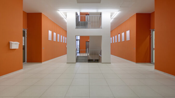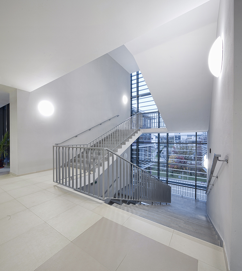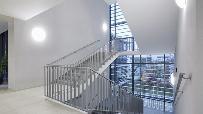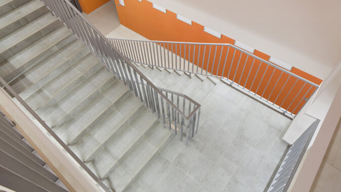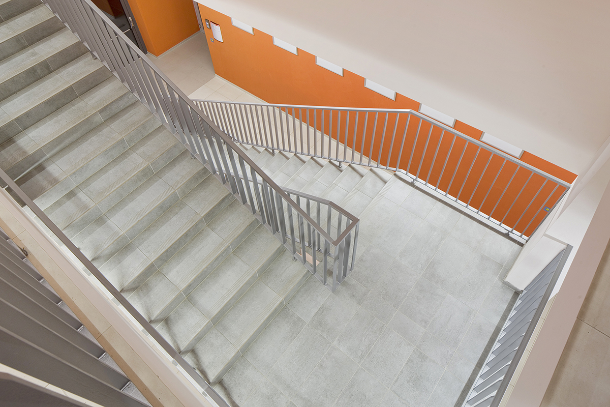 Betonovou stěrku evokuje dlažba schodišťových ramen a podest, která se liší od dlažby ve schodišťové hale a na chodbách. Architekt pro tyto prostory navrhl dlažbu RAKO CEMENTO ve formátu 30×60 v odstínu šedé. Série CEMENTO vyniká výbornými technickými parametry a protiskluzností. Díky tomu je možné ji využít nejen pro interiér, jako na této realizaci, ale i pro navazující exteriér (terasy, balkony, bazény atd.).