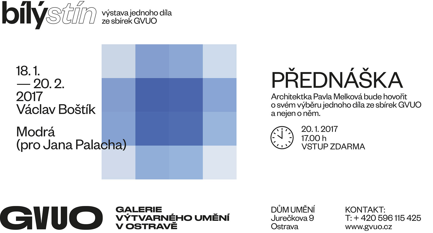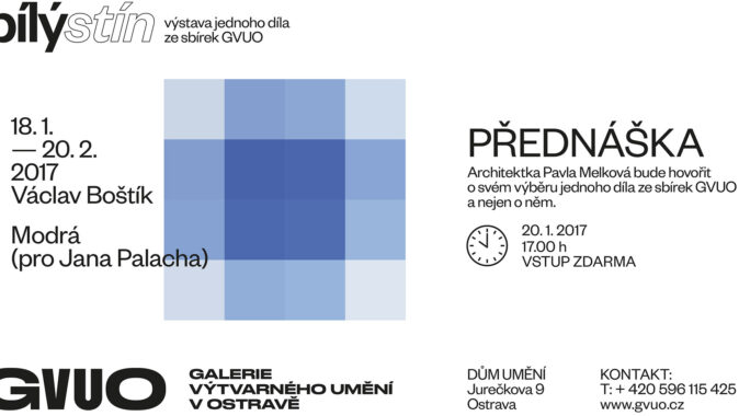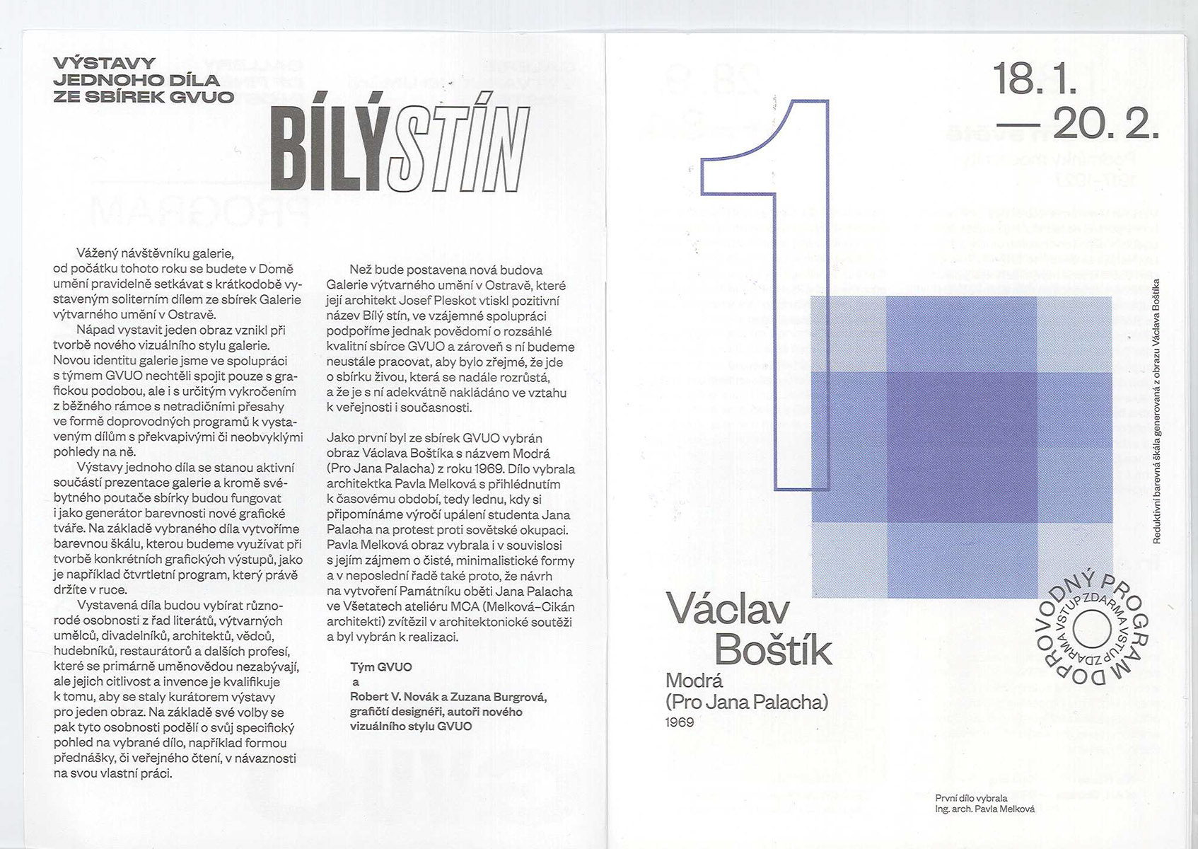 Jako první byl ze sbírek GVUO vybrán obraz Václava Boštíka s názvem Modrá (pro Jana Palacha) z roku 1969. Dílo vybrala architektka Pavla Melková s přihlédnutím k časovému období, tedy lednu, kdy si připomínáme výročí upálení studenta Jana Palacha na protest proti sovětské okupaci. Pavla Melková obraz vybrala i v souvislosti s jejím zájmem o čisté, minimalistické formy a v neposlední řadě také proto, že návrh na vytvoření Památníku oběti Jana Palacha ve Všetatech ateliéru MCA (Melková–Cikán architekti) zvítězil v architektonické soutěži a byl vybrán k realizaci.