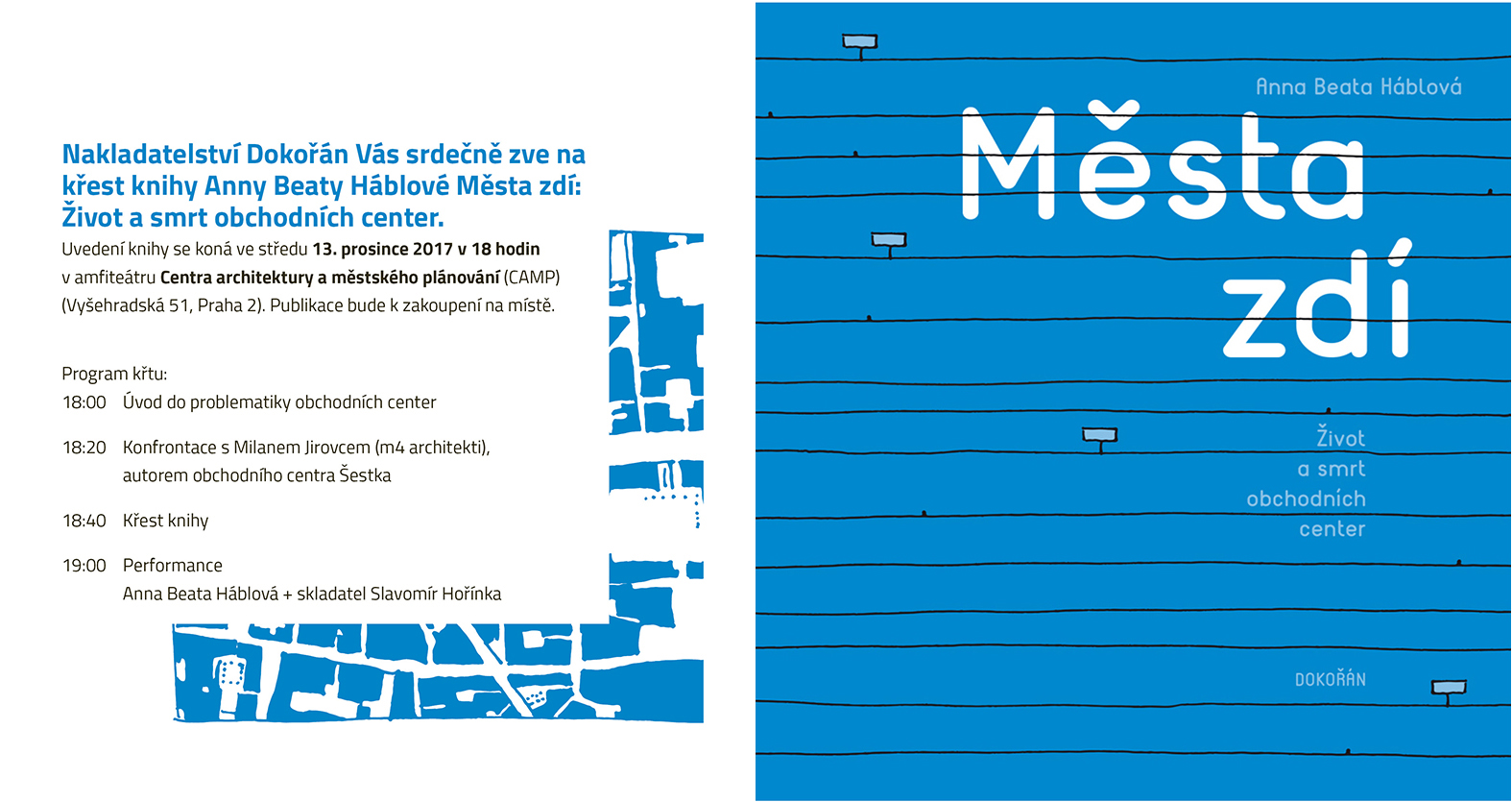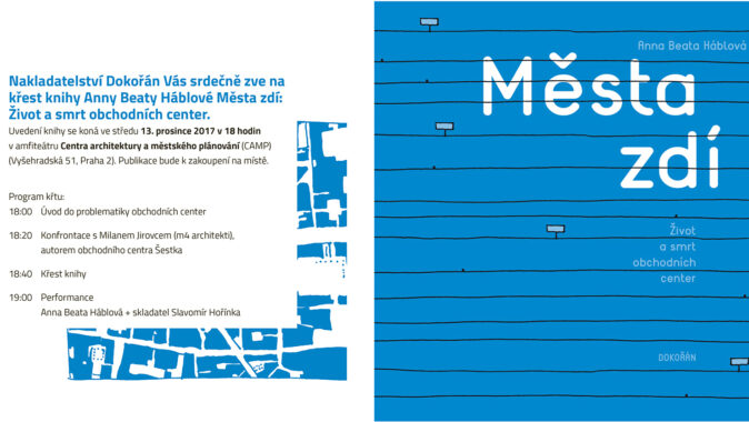 Křest knihy Anny Beaty Háblové Města zdí: Život a smrt obchodních center, který se uskuteční ve středu 13. prosince 2017 v 18 hodin v amfiteátru Centra architektury a městského plánování (CAMP) Vyšehradská 51, Praha 2.