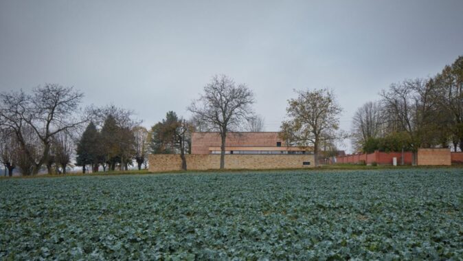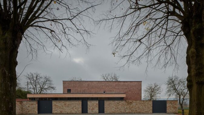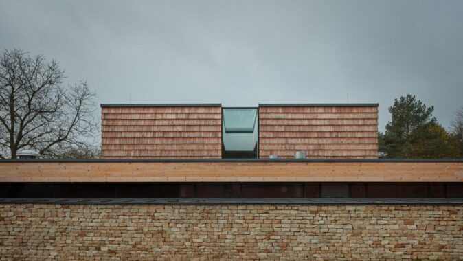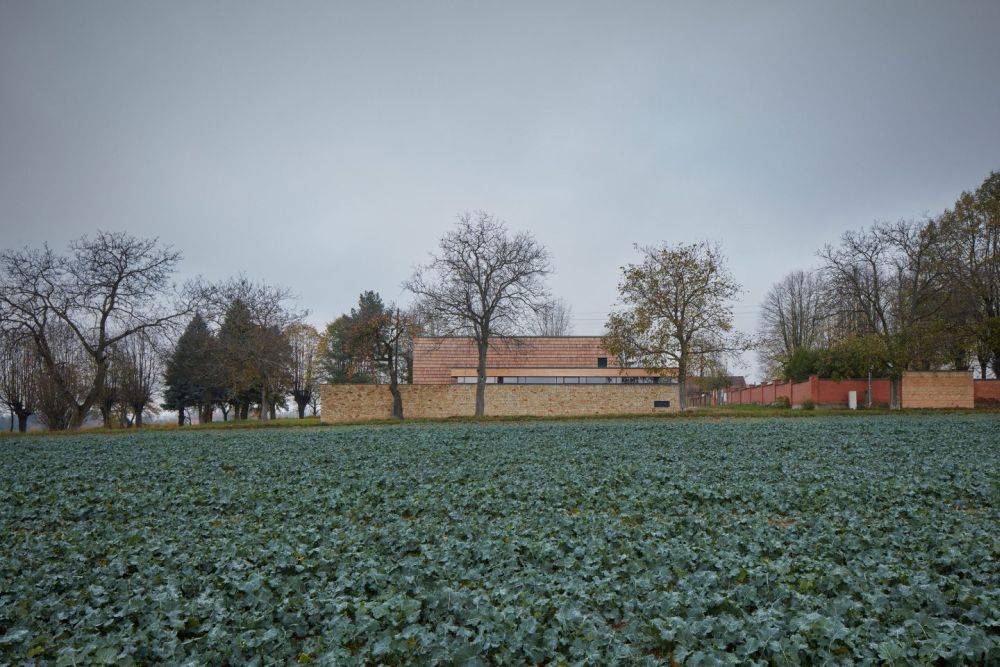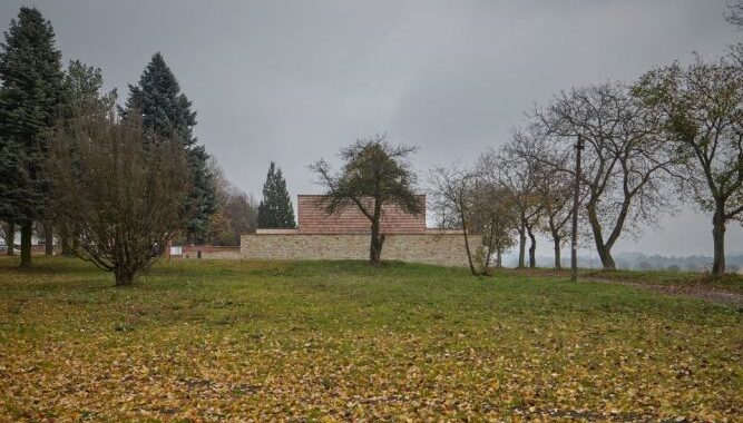Novostavba navazuje na linii opukových zdí hřbitova s kaplí