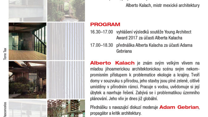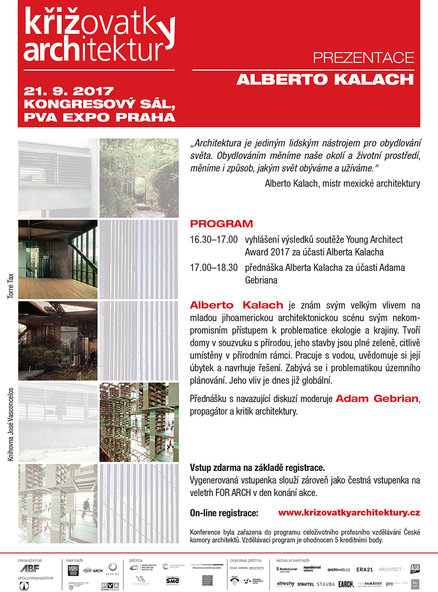 Alberto Kalach je znám svým nekompromisním přístupem k problematice ekologie a krajiny. Tvoří domy v souzvuku s přírodou, pracuje s vodou, uvědomuje si její úbytek a navrhuje řešení. Zabývá se i problematikou územního plánování. „Architektura je jediným lidským nástrojem pro obydlování světa. Obydlováním měníme naše okolí a životní prostředí, měníme i způsob, jakým svět obýváme a užíváme“, říká Alberto Kalach, který vystoupí na letošních Křižovatkách architektury při veletrhu FOR ARCH.