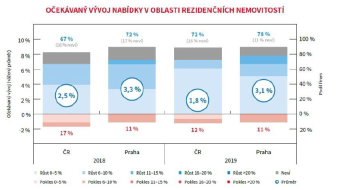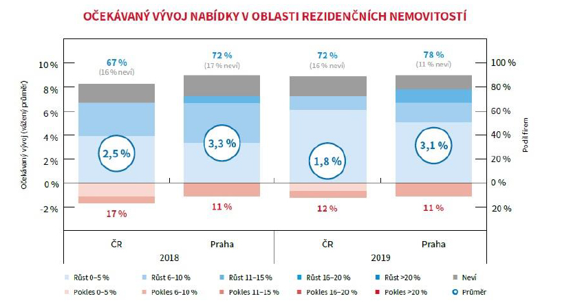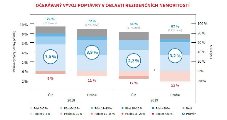2Poptávkapo rezidenčních nemovitostech poroste v tomto i příštím roce rychleji než nabídka, a to v celé České republice. Největší nárůst poptávky je očekáván v Praze, kde dosáhne úrovně 3,9 procenta v roce 2018 a 3,2 procenta v roce 2019. V mimopražských regionech v tomto roce predikují ředitelé developerských firem růst poptávky o 3,0 procenta a v příštím pak o dalších 2,2 procenta.Zvýšený zájem o byty kvůli zpřísnění podmínek pro čerpání hypotečních úvěrů dosud zaznamenaly dvě třetiny (67 procent) developerských firem. Zbývající třetina se u svých zákazníků s podobným trendem zatím nesetkala.