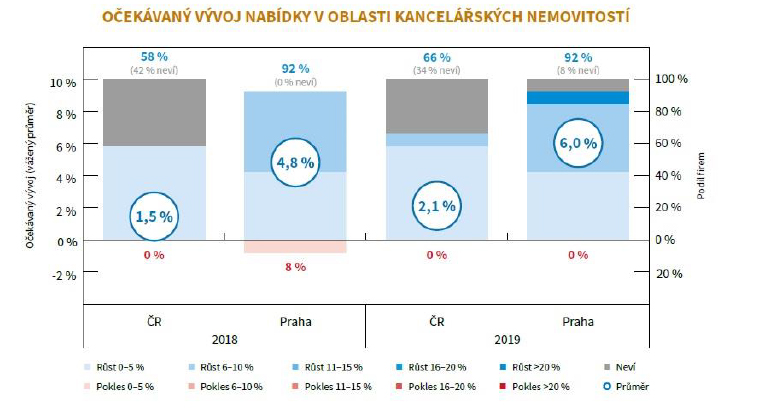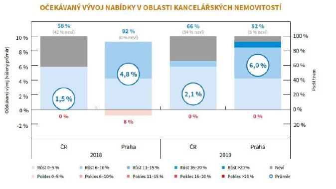 V oblasti kancelářského developmentu nabídne Praha v roce 2018 v průměru o 4,8 procenta více nových nemovitostí než v roce minulém. V ostatních regionech České republiky je očekávané tempo růstu nabídky oproti hlavnímu městu v tomto segmentu třetinové (1,5 procenta). V dlouhodobém horizontu developeři predikují další navýšení nabídky, kdy zatímco v regionech dosáhne její růst 2,1 procenta, v hlavním městě se zvýší na úroveň 6,0 procenta. Jejím motorem je především zájem firem a příznivé podmínky pro realizaci projektového financování.