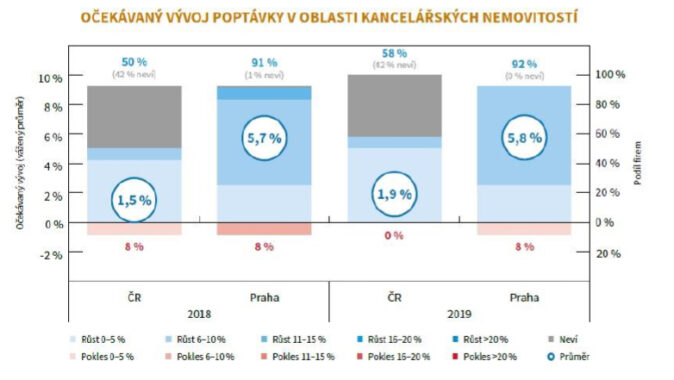 Také u poptávky po pražských kancelářích jev roce 2018 očekáván převis poptávky nad nabídkou (růst 5,7 procenta). Oproti tomu v ostatních regionech ČR bude poptávka v letošním roce růst stejným tempem jako nabídka (1,5 procenta). V roce 2019 pak developeři očekávají pokrytí růstu poptávky po kancelářských nemovitostech nabídkou jak v Praze (růst 5,8 procenta), tak v mimopražských regionech (růst 1,9 procenta).Poptávku po kancelářských nemovitostech aktuálně nejvíce podporuje celkový ekonomický vývoj.