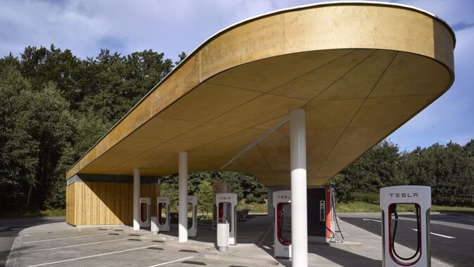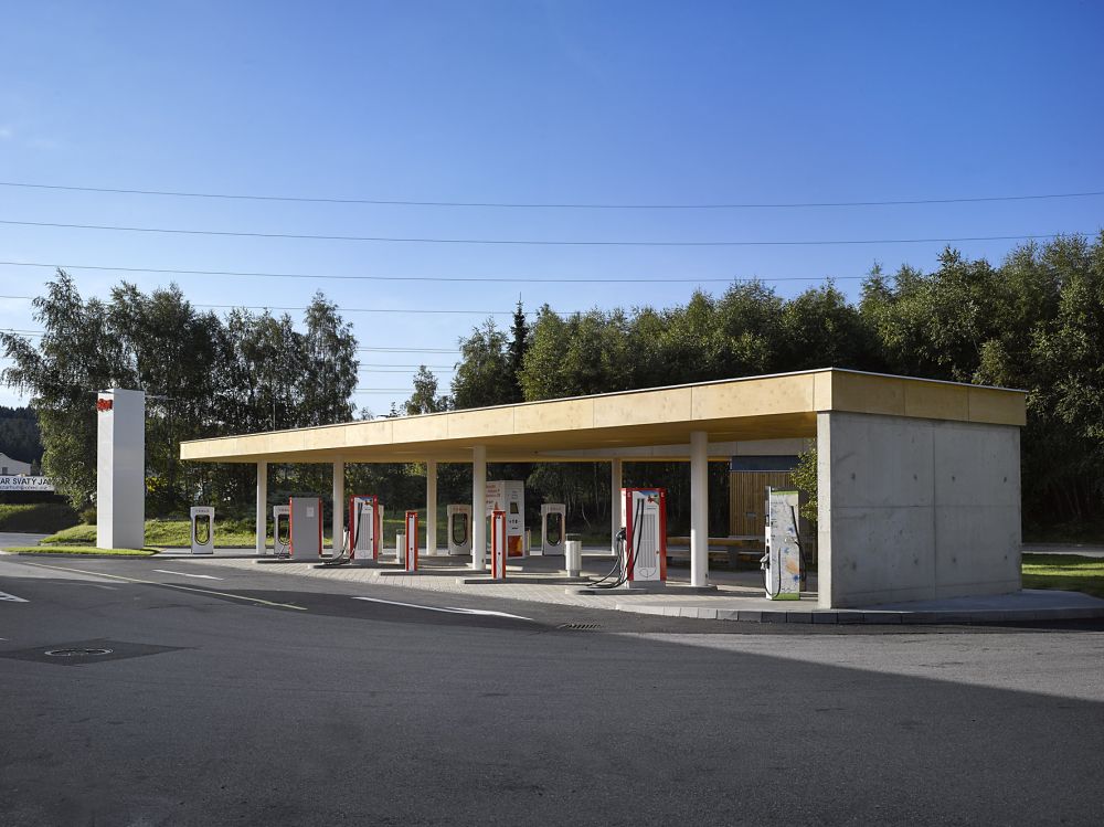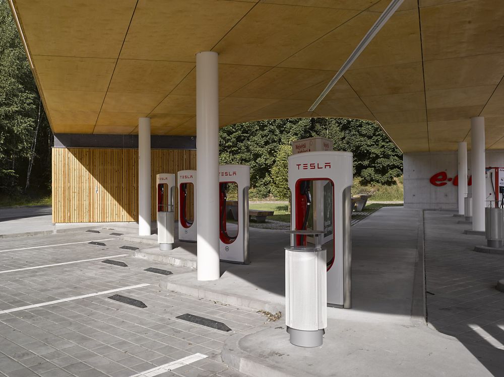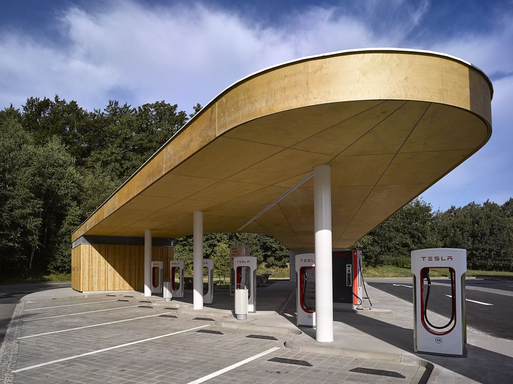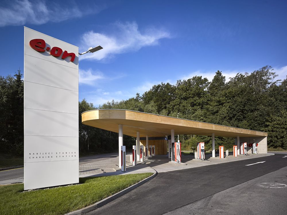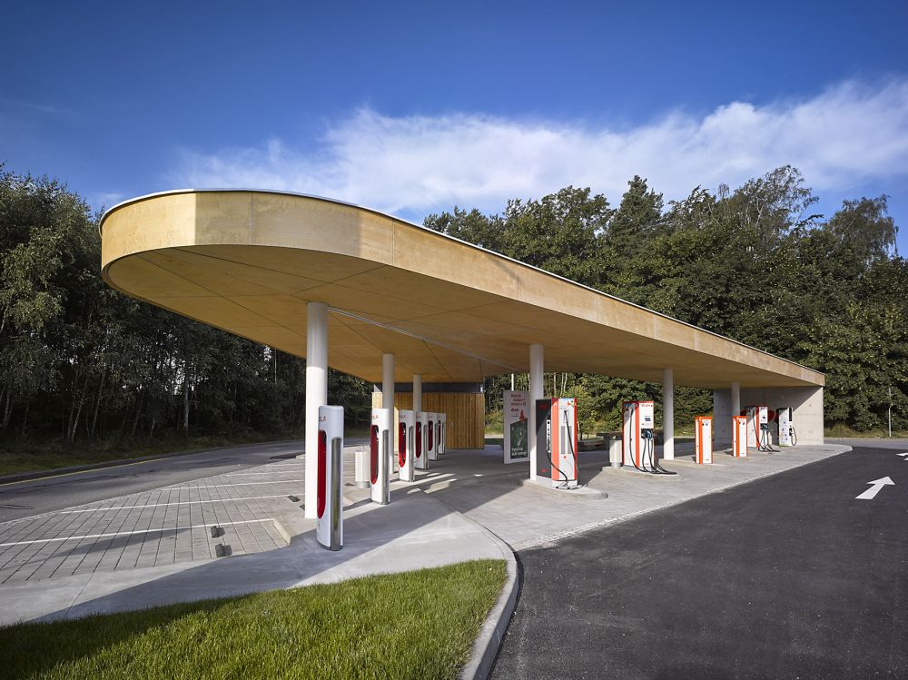 Protože nabíjení elektromobilů trvá asi dvacet minut, bylo naším cílem v omezené ploše, kterou jsme měli k dispozici, vytvořit příjemné prostředí odlišné od charakteru benzinek. Současně jsme drobnou stavbou chtěli vyjádřit dynamiku i provozní „čistotu“ elektromobilů a jejich přívětivost vůči životnímu prostředí. Stavba má tvar dřevěného bumerangu, v jehož vnitřním prostoru je malý zelený ostrůvek s dřevěnými lavicemi pohledem otevřený k zalesněné stráni. Tento první supercharger v České republice využívá sociální zařízení sousední čerpací stanice.