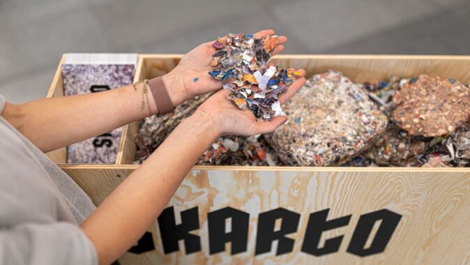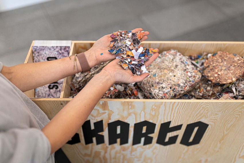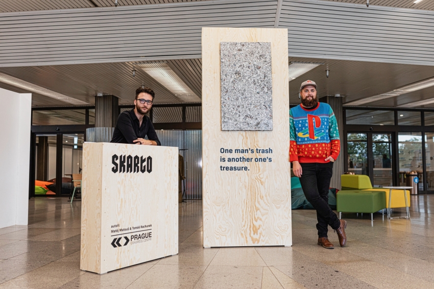 „Rozhodli jsme se vzít desítky kilogramů katalogů, vytvořených z pogumovaného papíru, který nelze recyklovat a skončil by ve spalovně či na skládce. Tyto katalogy jsme skartovali na drť. Spojili jsme se s restaurátorkou a expertkou na materiály a s její pomocí se nám podařilo vytvořit umělý mramor, jehož základní stavební jednotku tvoří tato papírová drť. Po mnoha experimentech se nám podařilo vytvořit deskový materiál, který jsme nazvali SKARTO a následně ho použijeme na vytvoření mobiliáře KCP,“ říká Tomáš Rachunek.