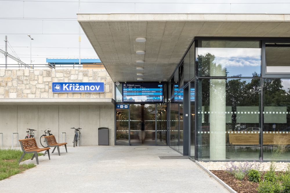 Původní výpravní budova železniční stanice Křižanov byla postavena roku 1955, leží na celostátní trati Kúty – Brno – Havlíčkův Brod a je přestupním uzlem vlakové dopravy v oblasti Velkého Meziříčí a Studence. Je tu také napojení na autobusové linky zajišťující dopravu cestujících do okolních měst a obcí. Průměrná denní frekvence na této železniční stanici je 660 cestujících denně.