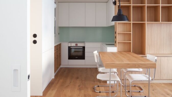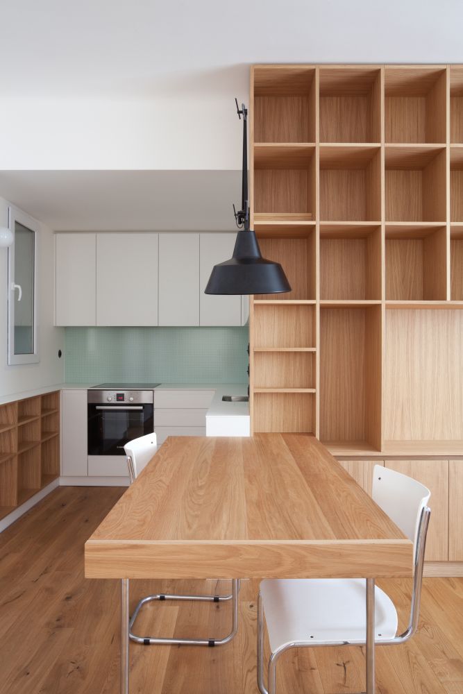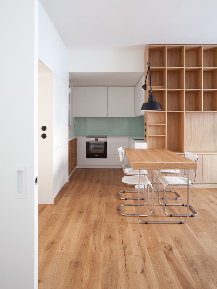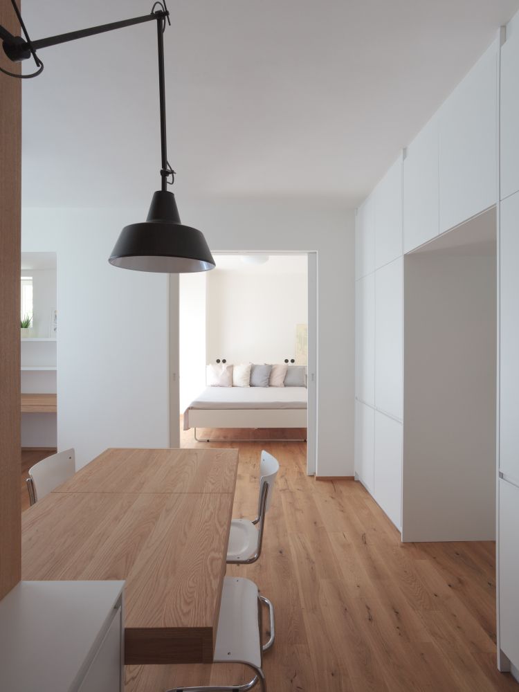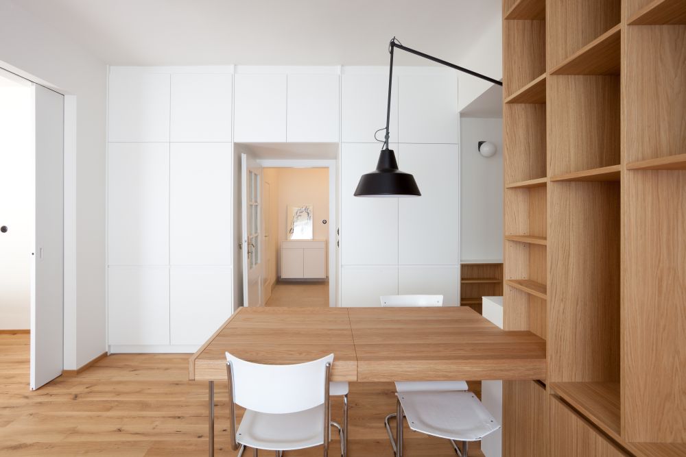 Atmosféra interiéru se odvíjí od použití klasických materiálů, jakými jsou teraco, bílé keramické obklady menšího čtvercového formátu, dřevo, a jejich kvalitního řemeslného opracování. Střízlivé materiálové řešení umožňuje nájemci bytu jeho snadné „zosobnění“ – třeba obrazy, pro které je ponechán dostatek místa.