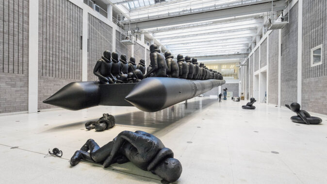 člun s postavami uprchlíků v nadživotní velikosti visí ve