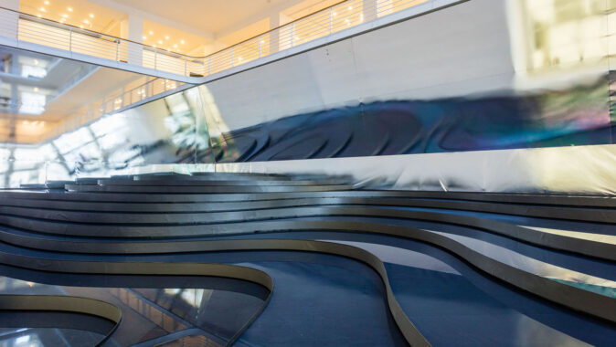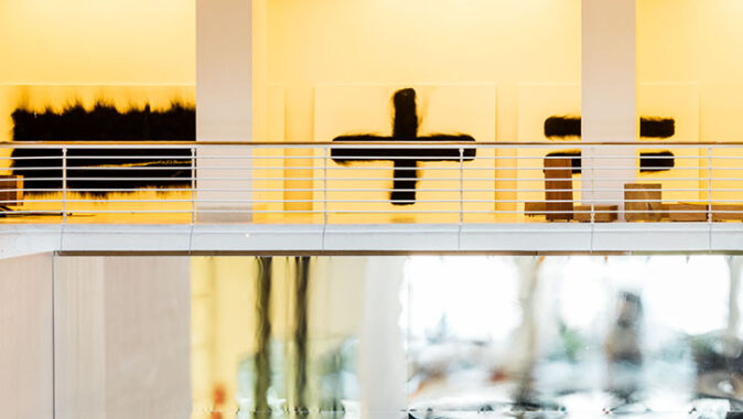 zrcadlí minimalistickou architekturu funkcionalistické dvorany, pro niž bylo