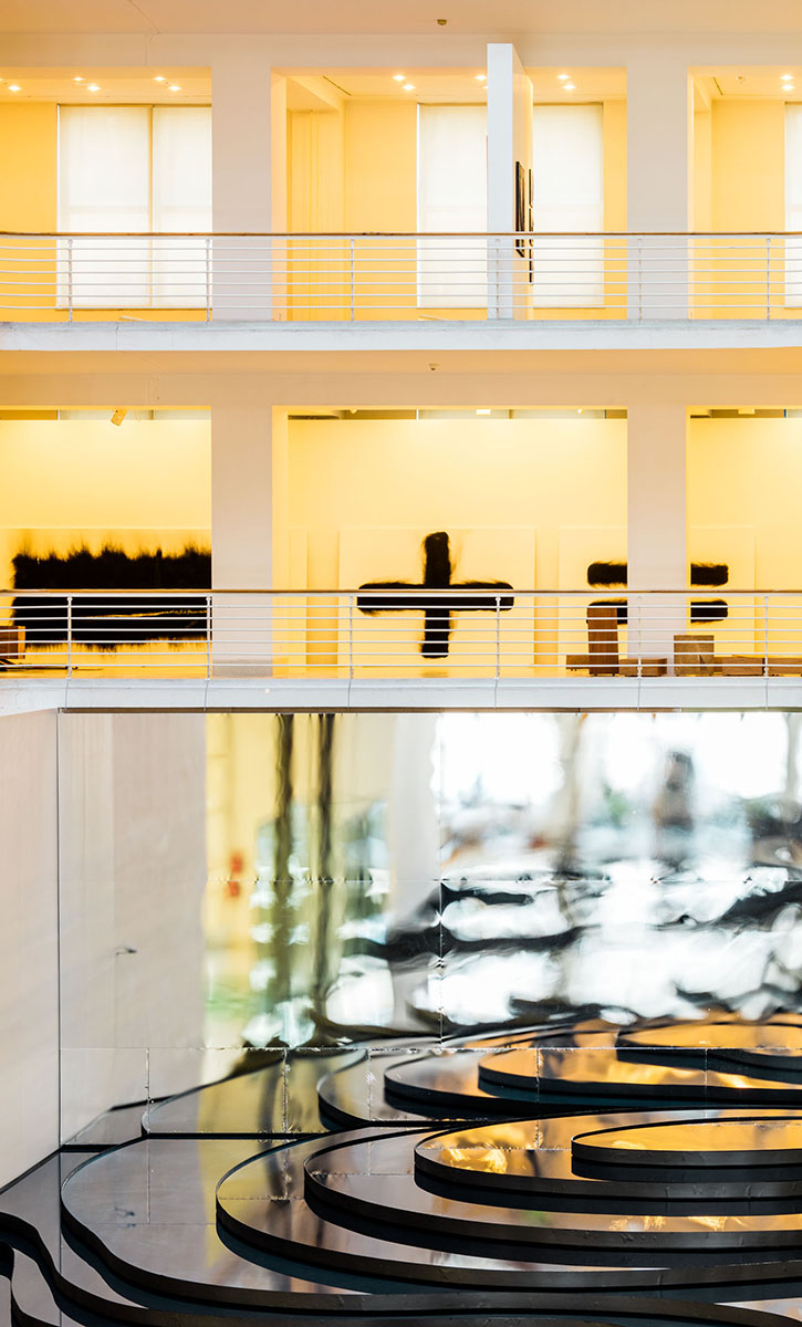 zrcadlí minimalistickou architekturu funkcionalistické dvorany, pro niž bylo