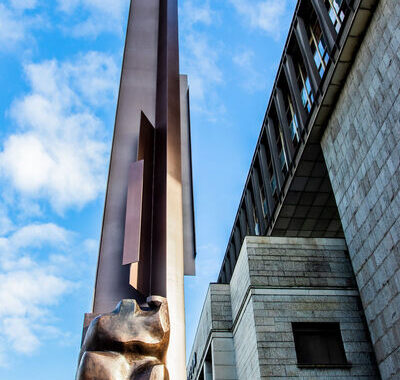 Vzhledem k hmotnosti původně navrhovaného bloku a problematice jeho ukotvení na ocelový pylon bylo třeba provést realizaci v jiném materiálu, který se blíží autorské práci a výtvarným záměrům. Po konzultaci se zástupci nositelů autorských práv a zástupci Národního památkového ústavu byl zvolen jako finální materiál bronz. V témže roce byly zahájeny první práce na realizaci plastiky, kterou byl, na základě výsledku veřejné soutěže, pověřen akademický sochař Antonín Kašpar.