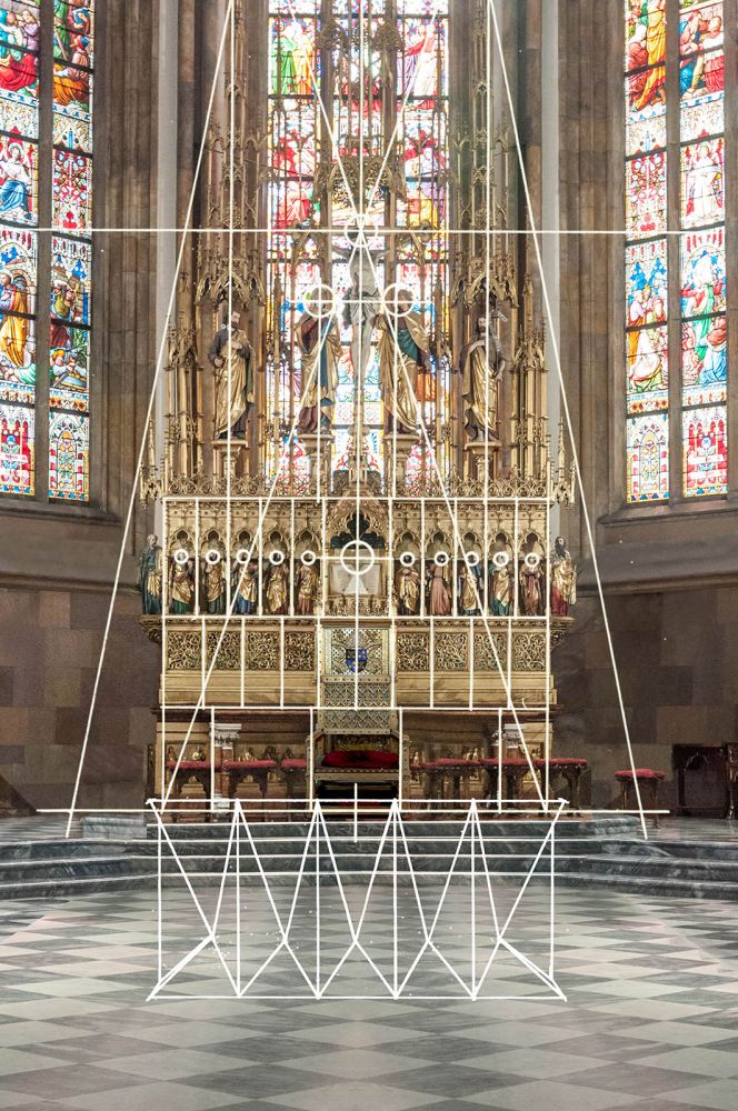 Menza je pevným hmotným bodem v prostoru. Analyzoval jsem geometrii hlavního tabernáklového oltáře (A. Prokop a K. Woresch) a zjistil jeho základní modul 32 cm i jeho geometrickou osnovu, na které je vystavěn. Myšlenkově navazuje na pseudogotický oltář souvztažností proporcí i členění, napojuje se na něj i v barevném řešení. V jeho tvaru lze najít i ozvěny sklípkových kleneb či kubismu. Kubická menza je symbolicky vystavěna na 12 trojúhelných pilířích, značících úplnost. (Ježíš má dvanáct apoštolů, dvanáct košů zbylo po nasycení (M 6,43), dvanáct bran má nebeský Jeruzalém (Zj 21,12). Augustin říká: Počet dvanáct je nejsvětější).