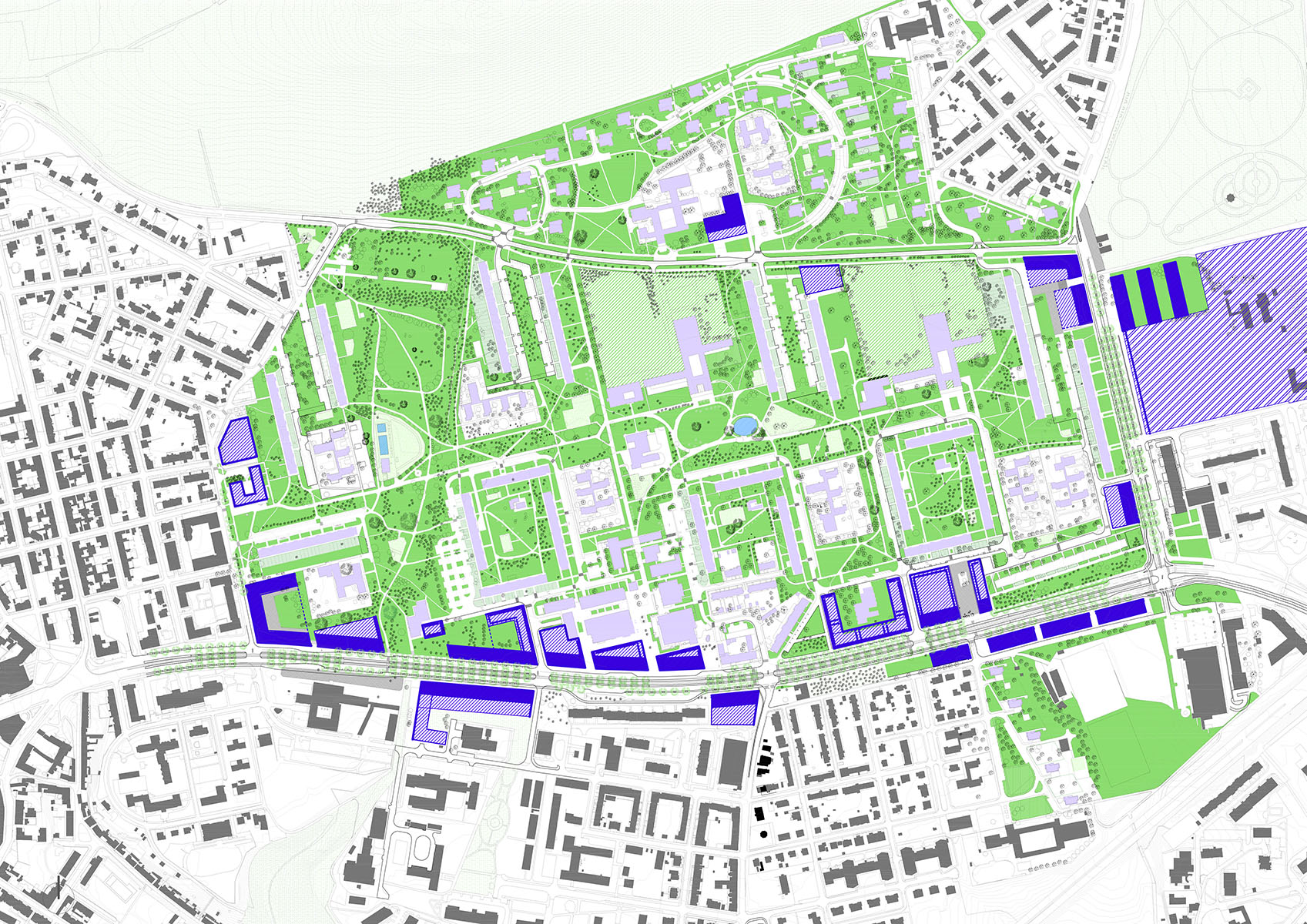 doplnit zástavbu o nízkopodlažní budovy (do 6 nadzemních pater). Ty by