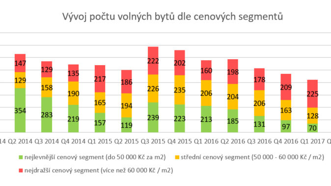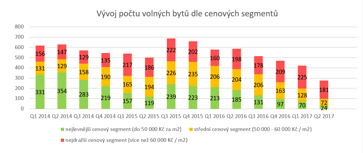 V průběhu loňského roku z nabídky stavitelů postupně mizely byty s cenou do 50 000 Kč za metr čtvereční. V uplynulých měsících nejenže tyto nejlevnější byty v Brně zmizely z nabídky úplně, ale výrazně ubylo také bytů s cenou do 60 000 Kč za metr. „Podíváme-li se na absolutní hodnoty počtu bytů v daných cenových kategoriích, vidíme, že těch nejdražších bytů příliš neubývá. Naopak segment cenově dostupného a levnějšího bydlení, který ještě předloni tvořil dvě třetiny trhu, je velmi omezený a zájem lidí o tyto byty je velký,“ komentuje úbytek levnějších bytů Alexej Veselý.