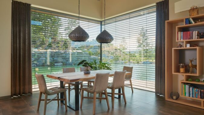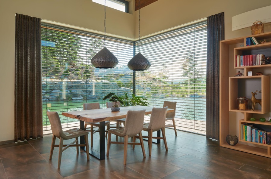 Někteří architekti nicméně volí rohová okna, která navozují pocit „otevřeného prostoru”. Nejčastěji ho dosáhnou pomocí lepených rohových oken, které v rohu spojuje jen tenká 2cm spára. Pokud to typ žaluzií dovolí, ideální je v tomto případě vedení lanky. To sice není tolik odolné proti větru, je ale designově čistší a nevyžaduje speciální komponenty.