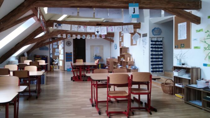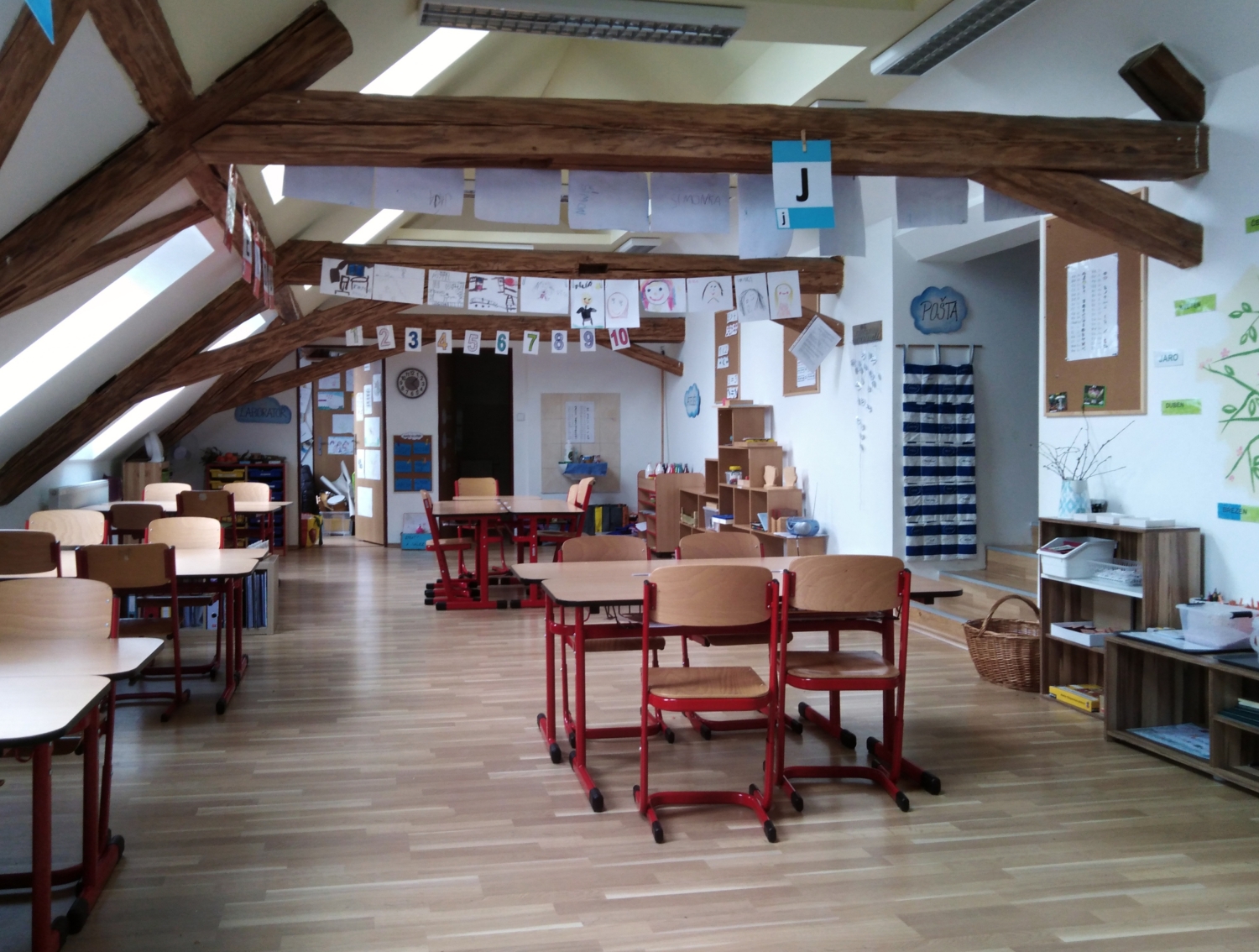 obytné podkroví. Prvňáčci zde mají třídu, které se říká „nebeská“.