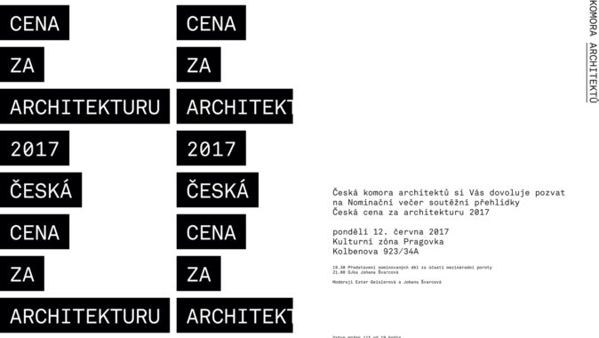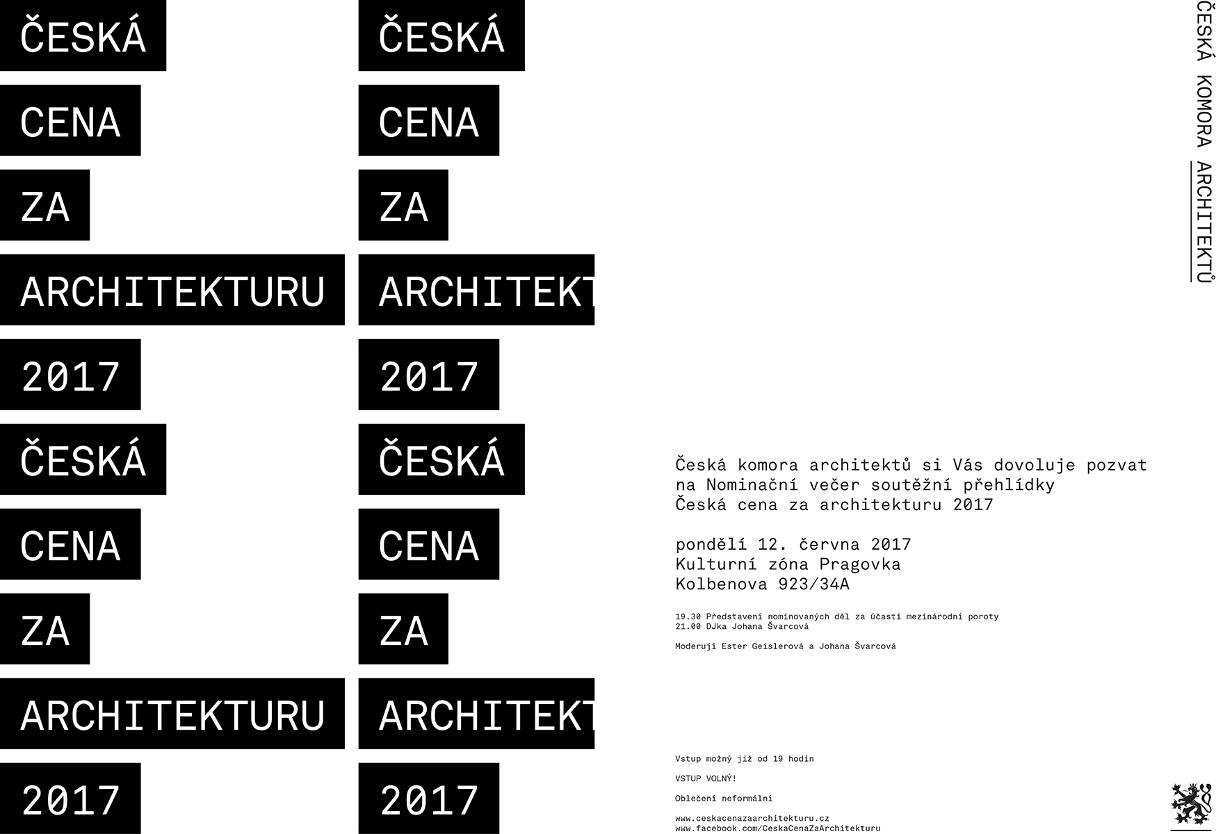 Česká komora architektů Vás zve na Nominační večer České ceny za architekturu 2017, který se uskuteční v pondělí 12. června 2017 od 19:30 hodin v kulturní zóně Pragovka (Kolbenova 923/34, Praha 9).