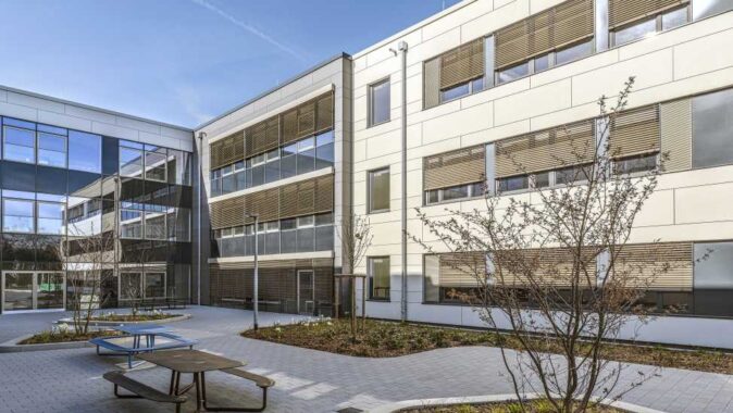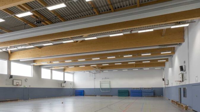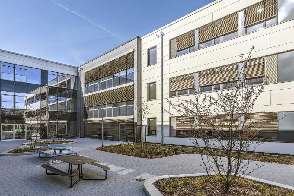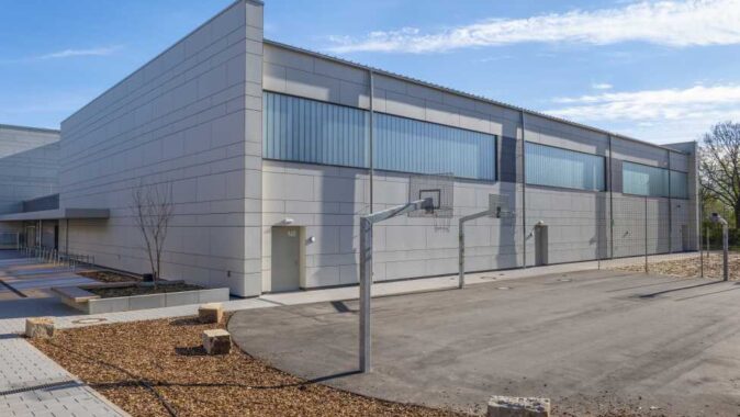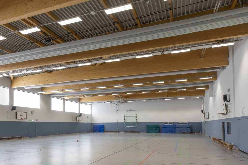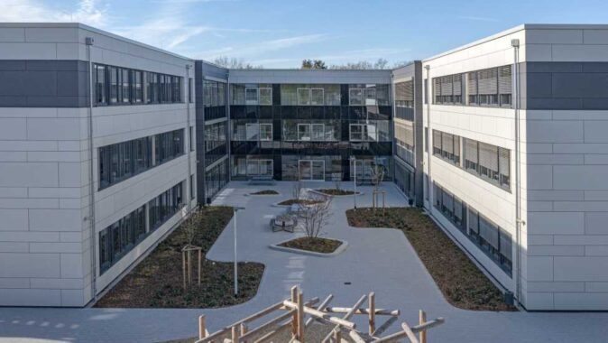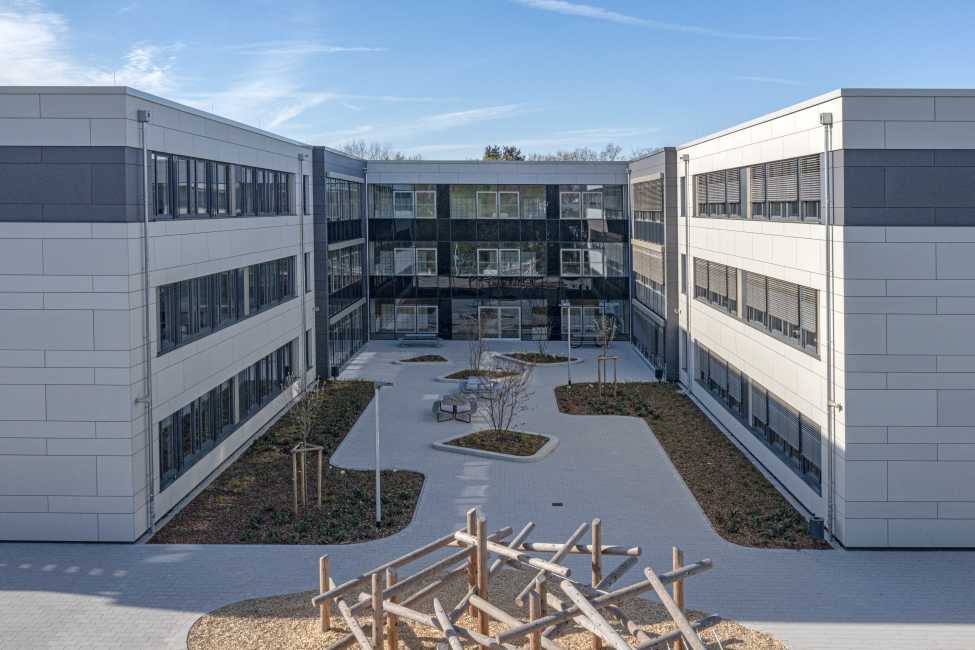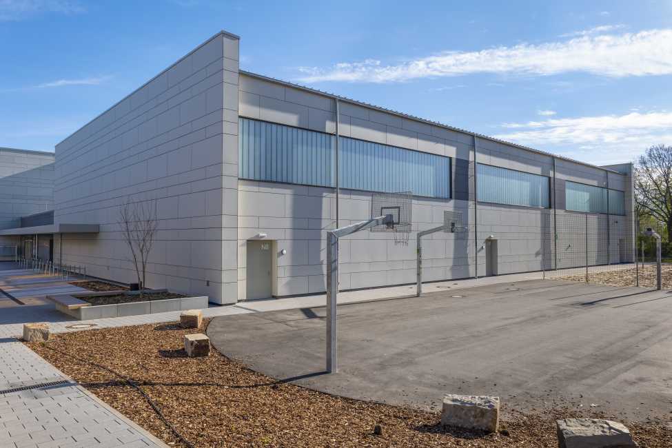 Architektonické studio vsadilo při plánování a realizaci nové školní budovy na udržitelné a odolné materiály. Pro obklad fasády byly použity odolné vláknocementové panely. Horizontální hliníkové okenní profily s energeticky úsporným zasklením dodávají stavbě strukturu a vizuálně ji propojují se stávající budovou. Redukovaný barevný a materiálový koncept pokračuje i ve vnitřních prostorách. Velké plochy s vysoce kvalitním designem dřeva zajišťují příjemnou atmosféru ve třídách a společenských místnostech. Důraz byl také kladen na harmonickou a decentní barevnost ve vnitřních i venkovních prostorách; výrazný navigační systém pro školní budovu a sportovní halu doplňuje tyto decentní barvy.