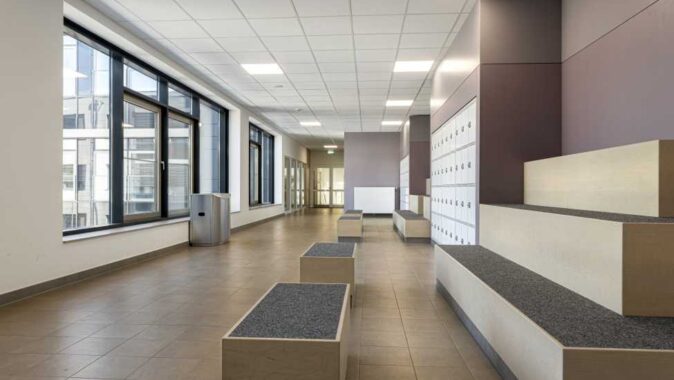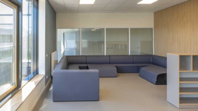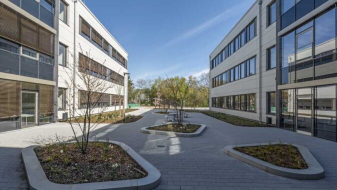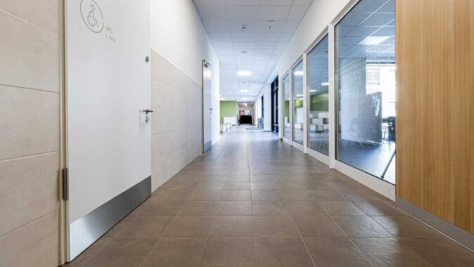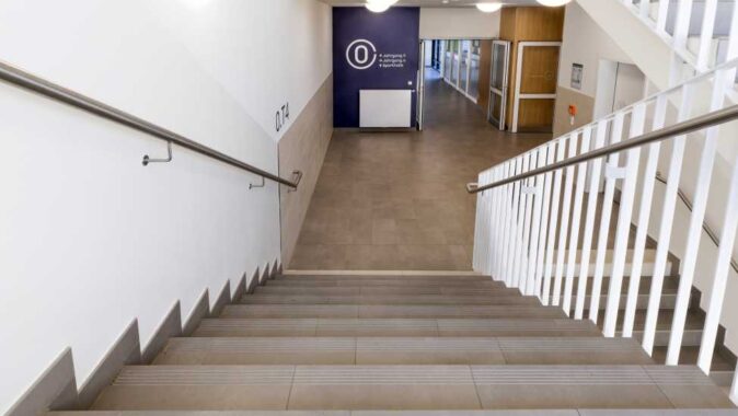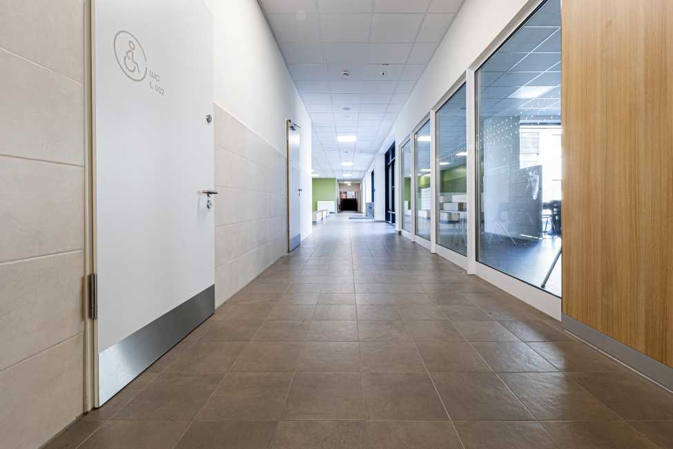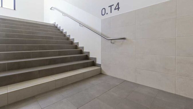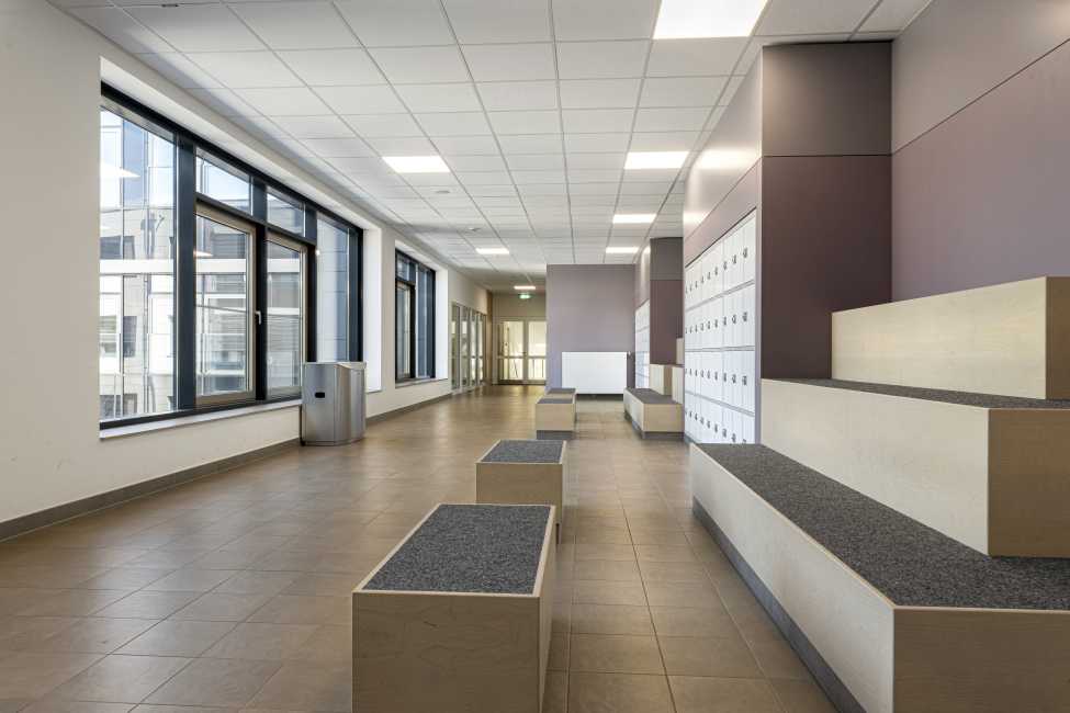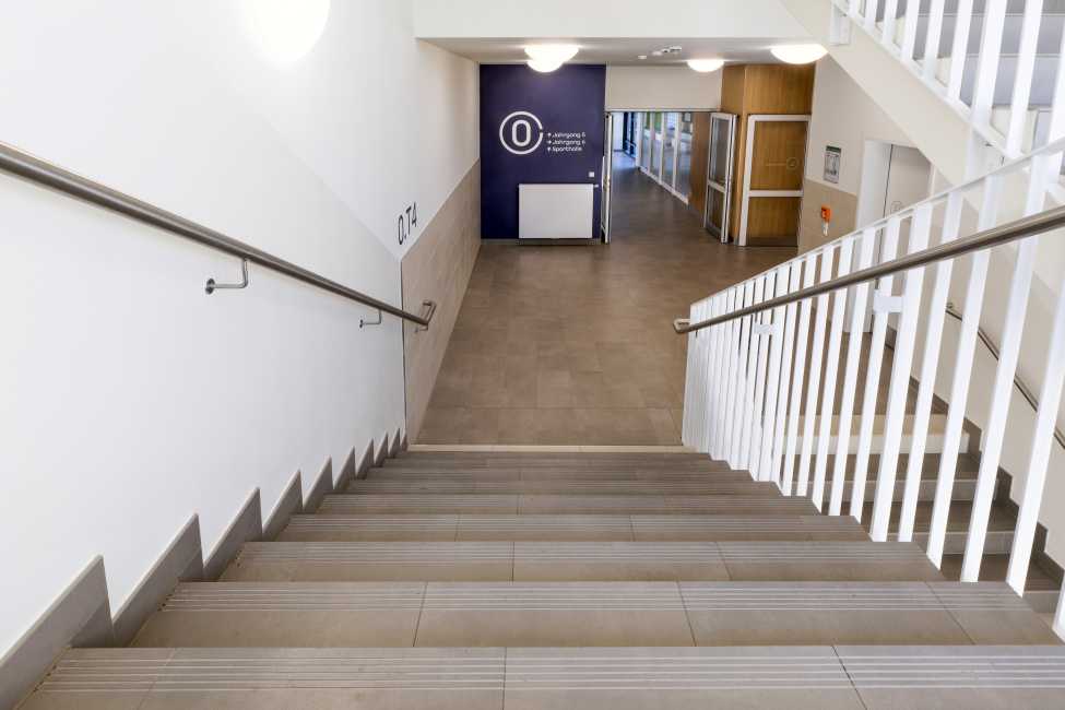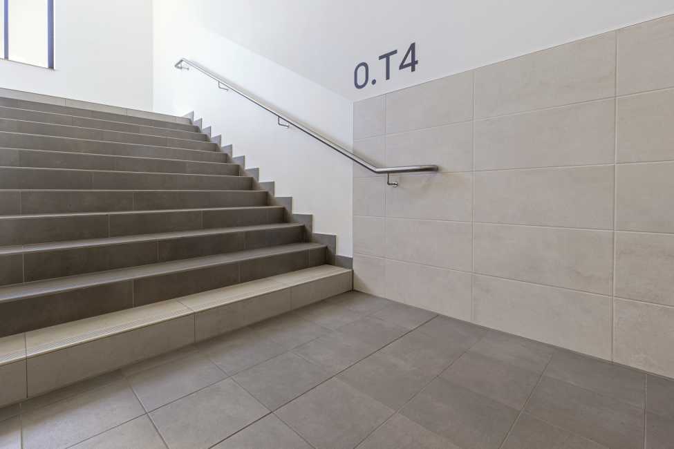Zvláštní pozornost si v projektu zaslouží podlahy z dlaždic RAKO. Ty byly v objektu položeny například na chodbách a na galeriích spojujících části budovy, ale také na schodištích. Architektka projektu Irmgard Kaufmann z architektonického studia PM k tomu vysvětluje: „Keramické podlahové krytiny pro nás byly správnou volbou. Důležitým důvodem je jejich odolnost i při velkém počtu studentů, kteří se v budově denně pohybují. Další důvod, proč jsme se rozhodli pro obklady značky RAKO: S RAKO jsme již spolupracovali a oceňujeme kvalitu, komplexnost technické nabídky, širokou škálu barev slinutých dlaždic a dobrý poměr ceny a výkonu.“