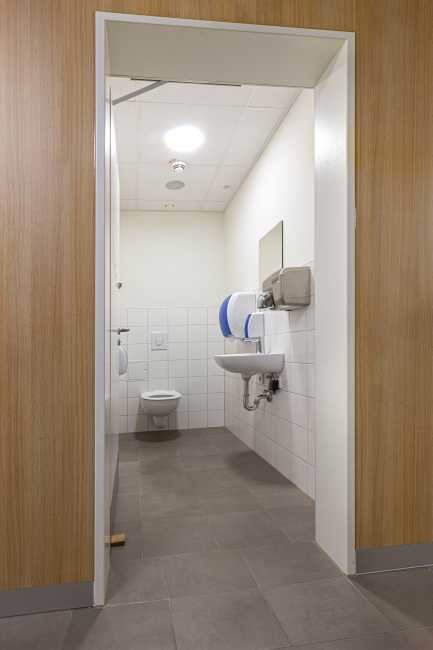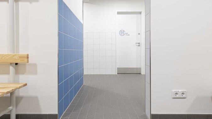 Architektka projektu Irmgard Kaufmann k volbě materiálů říká: „Odolnost slinutých dlaždic byla dalším důvodem, proč jsme je položili také až do poloviny výšky stěn na chodbách. I zde jsme hledali velkoformátové keramické krytiny ve světlých barvách a u RAKO jsme našli to, co jsme hledali.“ Pro podtržení harmonie designu podlahy a stěn se architektonické studio PM rozhodlo i pro obkládačky ze série Extra v barvě slonové kosti ve formátu 30 x 60 cm.