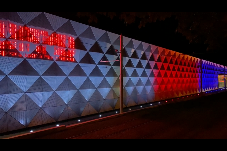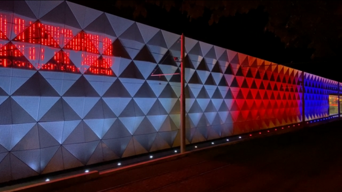 Nasvícení fasády ještě není definitivně hotové, dojde například k doladění loga dopravního podniku, přesto nabízí kolemjdoucím i cestujícím v projíždějících tramvajích nevšední pohled.