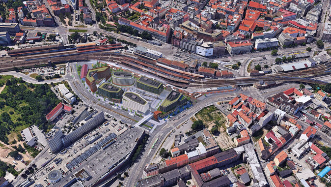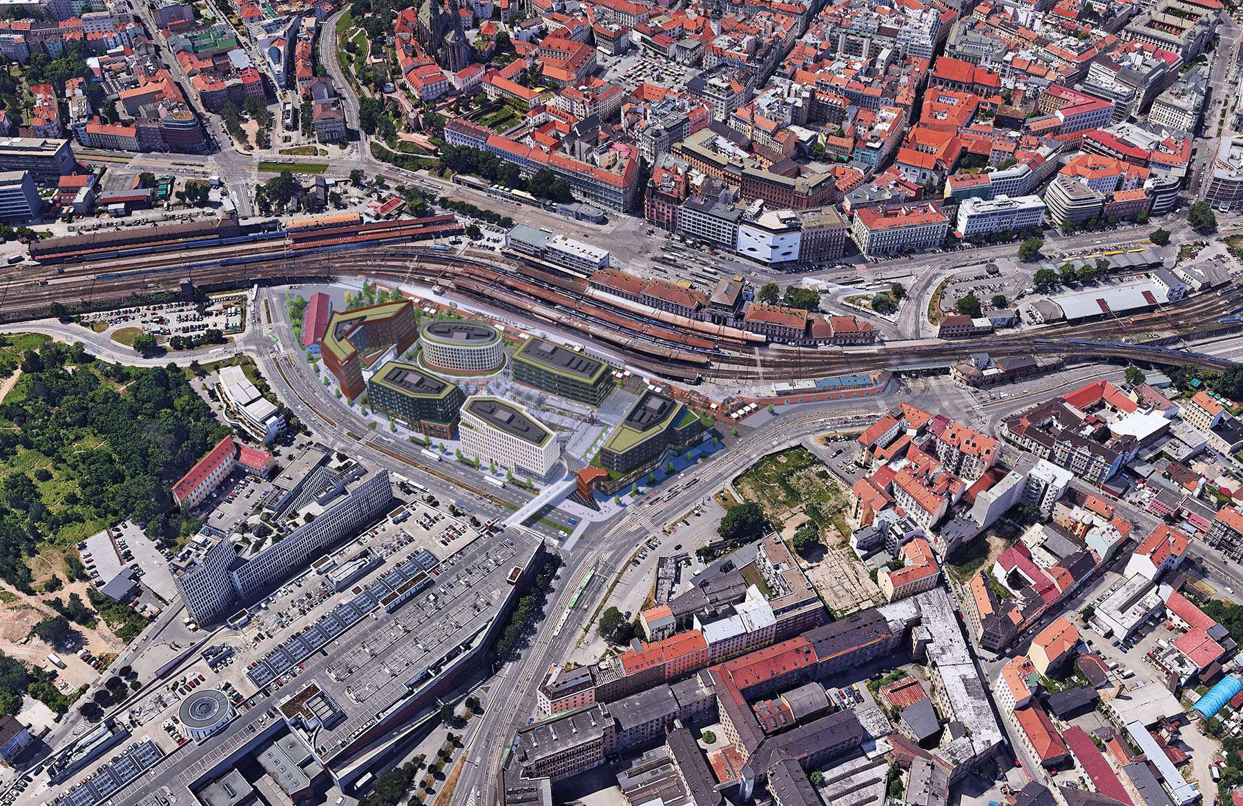 vizualizace budoucí podoby území jižně od brněnského hlavního nádraží mezi
