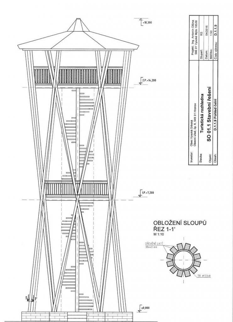 Podle něj je celokovová, 18 metrů vysoká rozhledna opláštěná dřevem, vyhlídková plošina je ve výšce 16 metrů.