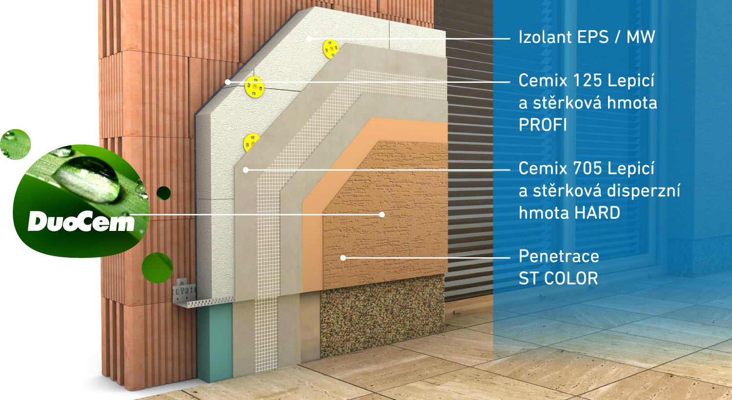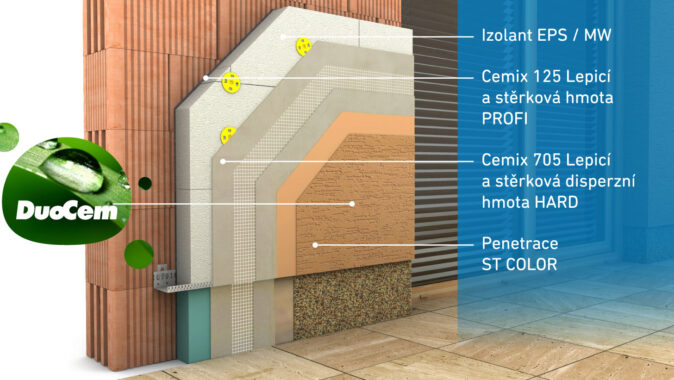 Novinka DuoCem je vhodná nejen na všechny typy tepelněizolačních kompozitních systémů (ETICS), ale také na všechny typy klasických fasád včetně použití na sanačních omítkových systémech. Novinka splňuje požadavky směrnice WTA 2-9-04/D.
