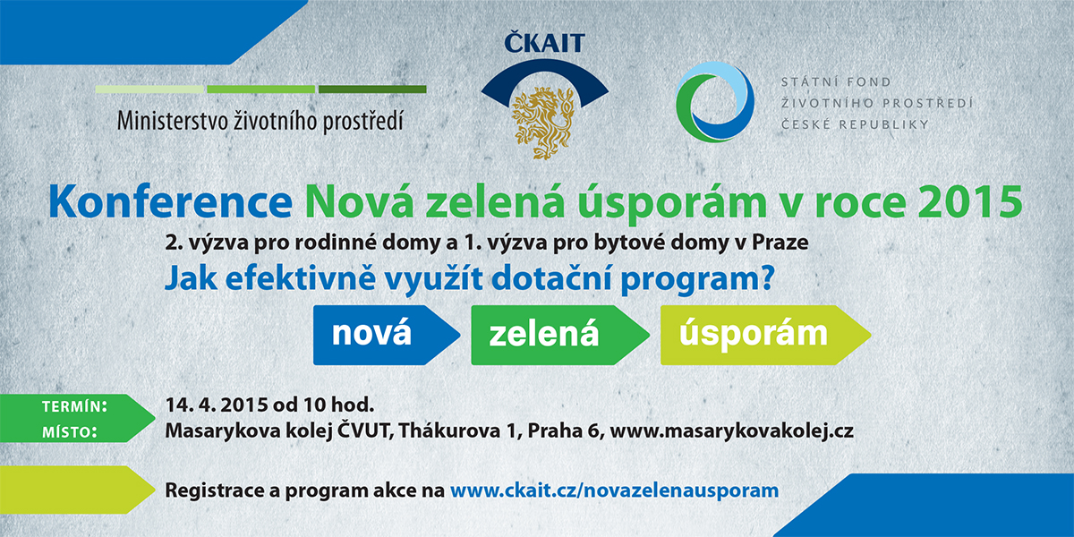 Česká komora autorizovaných inženýrů a techniků činných ve výstavbě (dále jen ČKAIT) spolu s Ministerstvem životního prostředí ČR, Státním fondem životního prostředí ČR a Ministerstvem obchodu a průmyslu ČR připravila tiskovou a celodenní odbornou konferenci dne 14. 4. 2015 k problematice programu Nová zelená úsporám v roce 2015. Akce se konala se v prostorách ČVÚT v Kongresovém centru Masarykova kolej, Thákurova 1, Praha 1 za účasti téměř 400 hostů.
