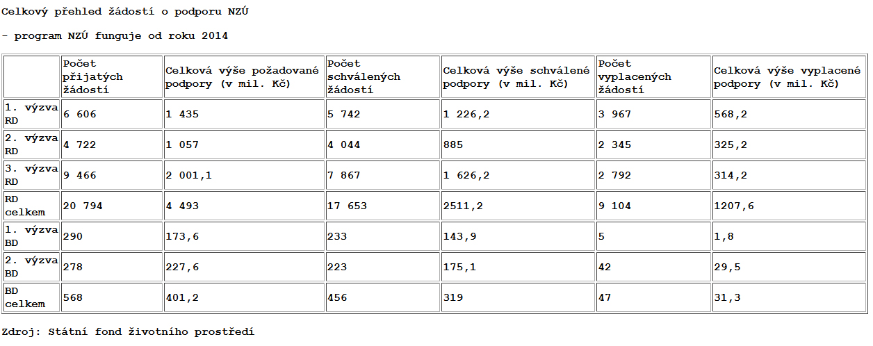 Za tři roky fungování Nové Zelené úsporám lidé podali přes 21 tisíc žádostí o dotaci a podle ministerstva životního prostředí získali celkem přes 1,2 miliardy korun. Zatím největší zájem byl podle MŽP o zateplení domů a také o výměnu zdroje tepla a instalaci solárních systémů, nejčastěji z Moravskoslezského, Středočeského a Jihomoravského kraje.