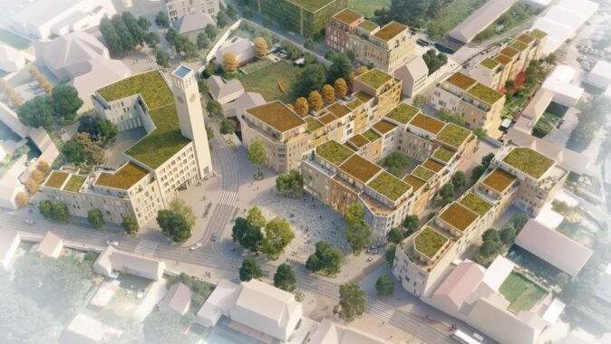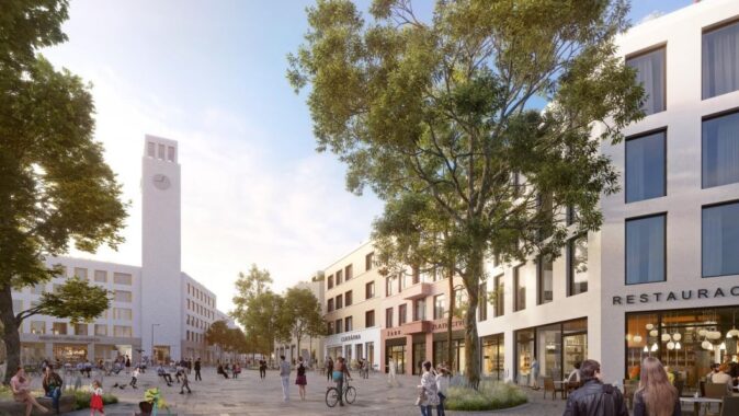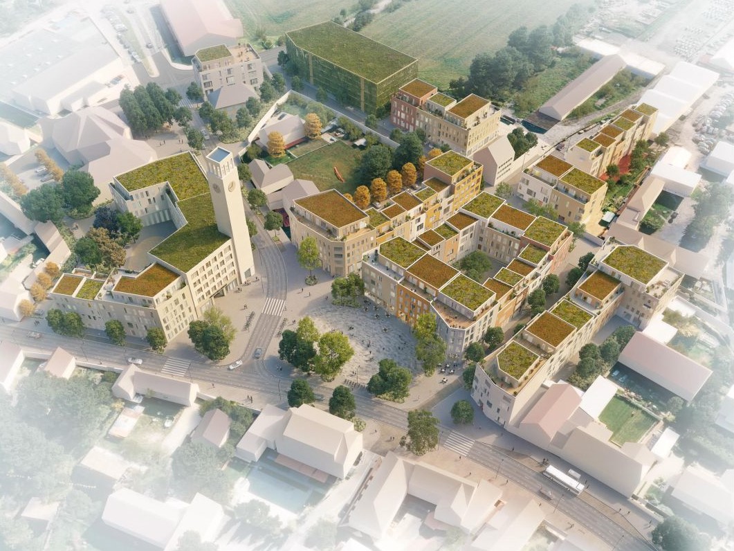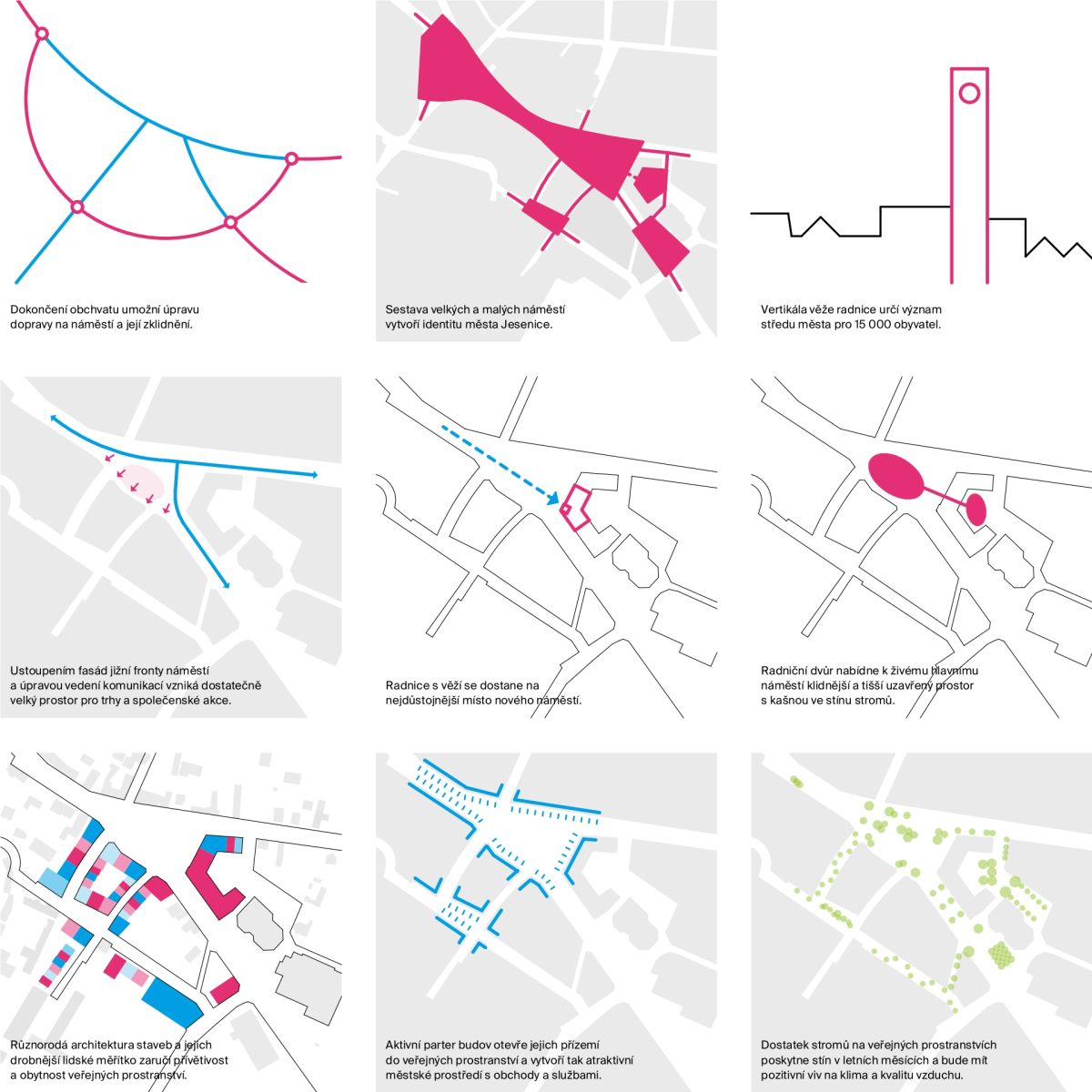 Centrum města Jesenice vzniká v historické stopě návsi nálevkovitého tvaru, která se jemně rozšiřuje v jižní frontě budov. Semknutá řada domů s radnicí a věží v čele náměstí vytváří důstojný městský prostor hodný velikosti sídla. Veřejná prostranství upravená zejména pro chodce vybízejí svou atraktivitou a živým parterem budov k setrvání a pobytu jak v běžných dnech, tak při slavnostních akcích a trzích.
