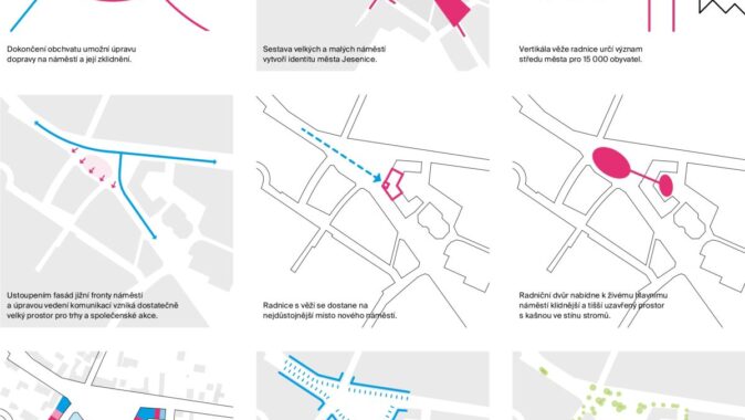 Město Jesenice po revoluci prošlo překotným stavebním vývojem zejména v oblasti bydlení. Stavební rozvoj probíhal živelně a chaoticky bez celkové koncepce. Městu chybí středobod ukotvený v prostoru a čase, který by vytvořil identitu a soudržnost nejen zástavby, ale i místních obyvatel. Strukturu veřejných prostranství pečlivě tvarujeme tak, aby navazovala na existující trasy a paměť místa. Z uspořádání zástavby je dodnes patrný tvar dvou návsí propojených širokou ulicí.