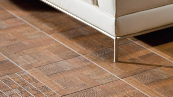 originálně. Slinuté glazované dlaždice napodobují dřevěnou skladbu