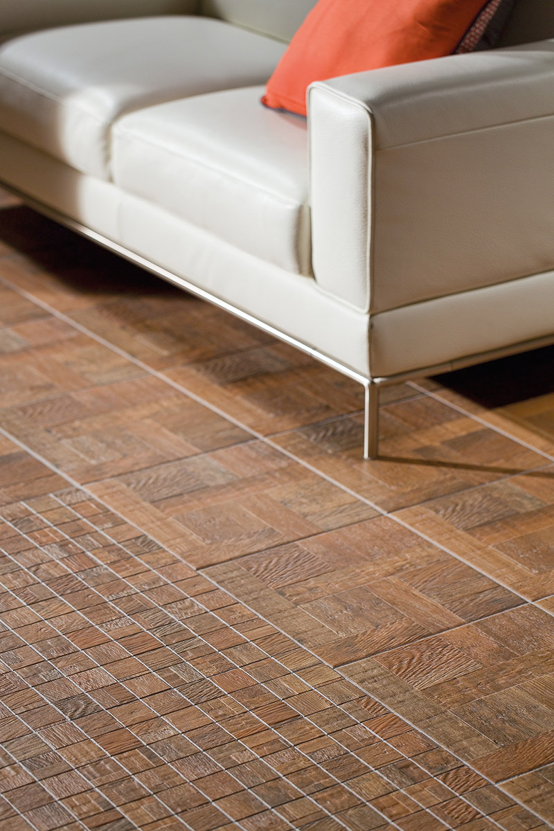 originálně. Slinuté glazované dlaždice napodobují dřevěnou skladbu
