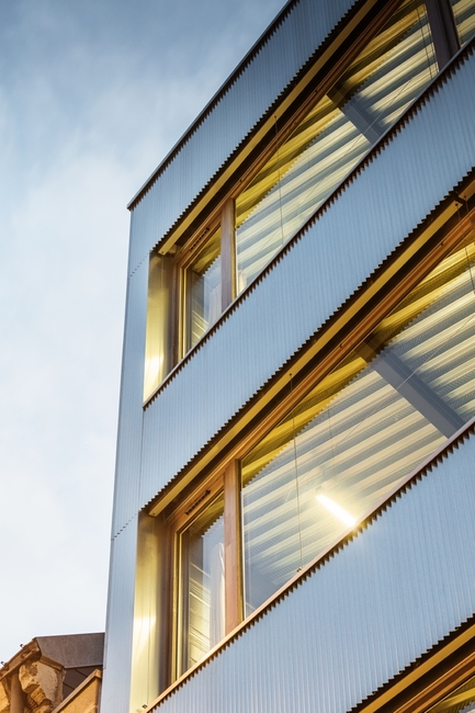 Jednoduchá a čistá fasáda je bez viditelných spojů, se skrytým kotvením, a dosahuje plochy pouhých 80 m2. Zaujme nejenom v technickém kontrastu s okolními stavbami, ale především díky své světelnosti. Lisovaná hliníková slitina fasádního profilu s pravidelnými průběžnými zuby s roztečí 40 mm, výškou 22 mm a s přírodním povrchem dodávají stavbě záři a lesk doslova za jakýchkoliv světelných podmínek, a to v každé roční době. Sousední pošmurné kamenné domy jsou oproti tomu ukázkou drsné a masivní funkcionalistické architektury dob minulých.