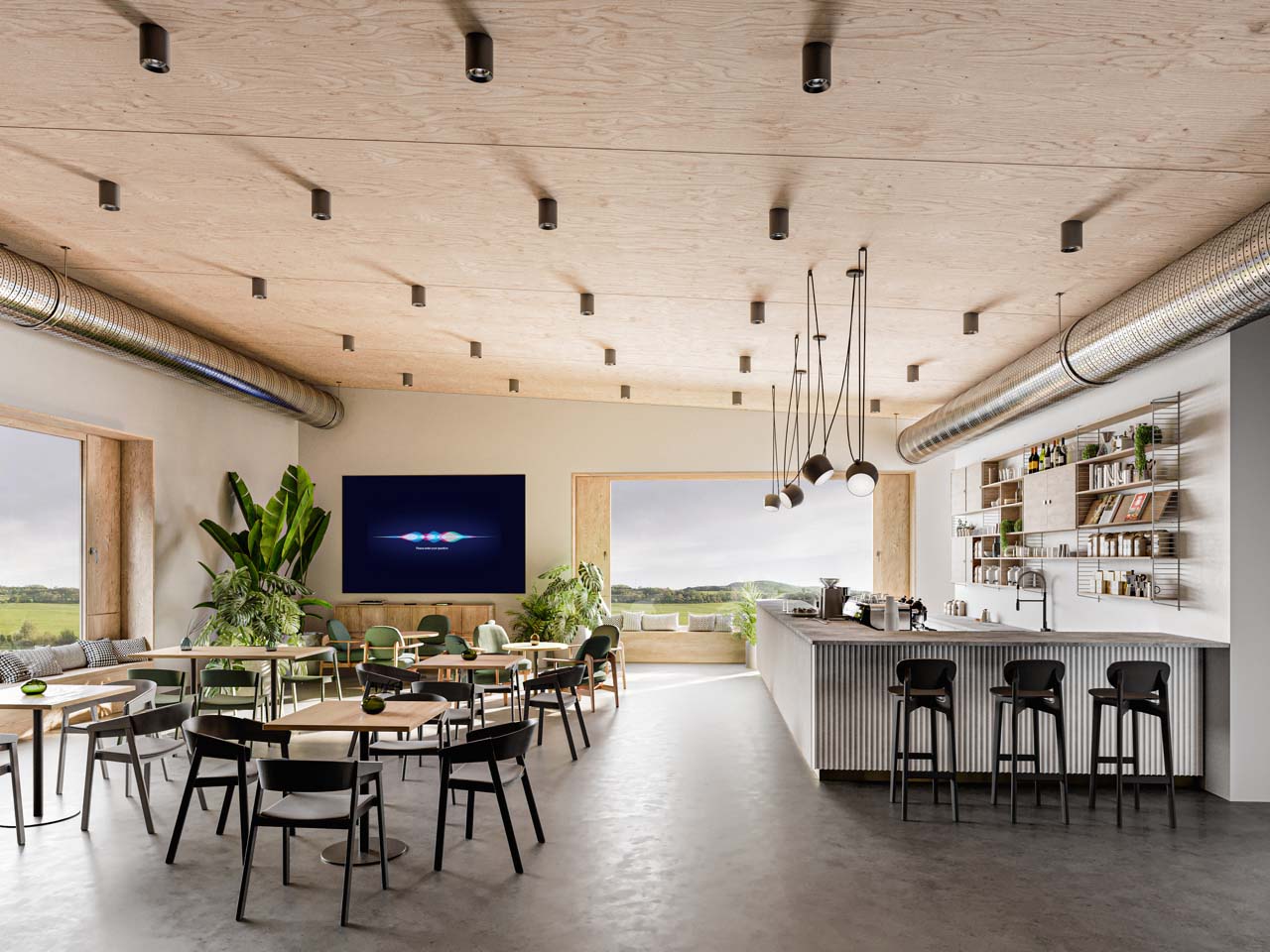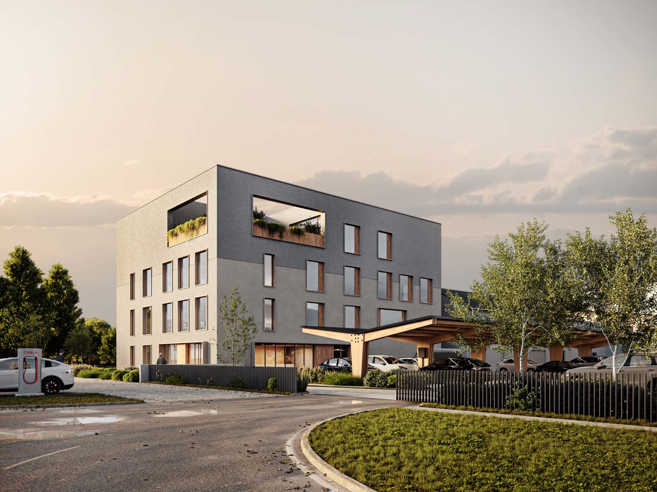 Architekti Studia Perspektiv navrhli centrálu společností GoPay a TERMS nedaleko Českých Budějovic. Projekt administrativní budovy a úpravy areálu rodinného podnikání se řídí principy udržitelnosti, potřebami zaměstnanců a požadavkem na nenáročnou údržbu. Novostavbu architekti pojali jako pasivní čtyřpatrovou dřevostavbu, jež výškou dosahuje povoleného limitu pro tento typ budov u nás, čímž se zařadí mezi nejvyšší v Česku. Areál koncipovali tak, aby v něm klient mohl uplatnit svůj zájem o vývoj technologií a získávání i uchovávání čisté energie. V souladu s tím bude provoz objektu čerpat z obnovitelných zdrojů. Kromě kultivace okolí se komplex také částečně otevře veřejnosti a poslouží regionu, například řidičům elektromobilů, kteří si zde budou moci dobít své stroje. Začátek realizace je plánován na podzim roku 2020.
